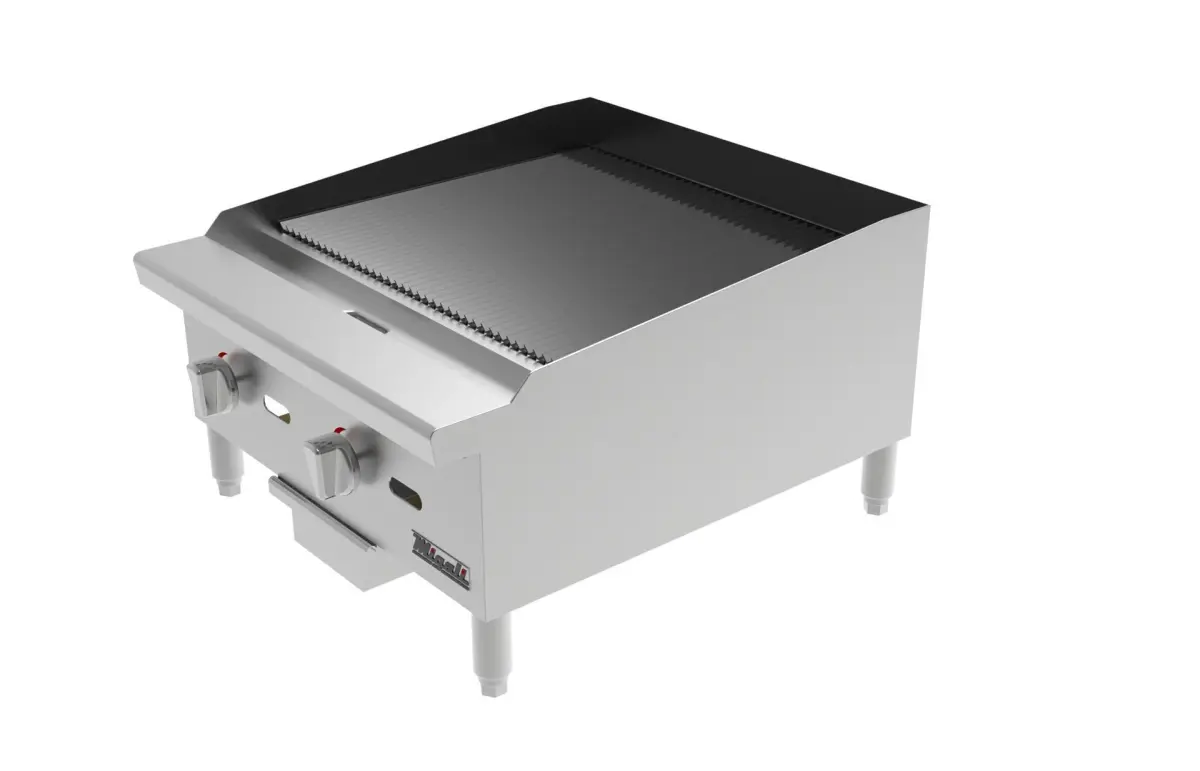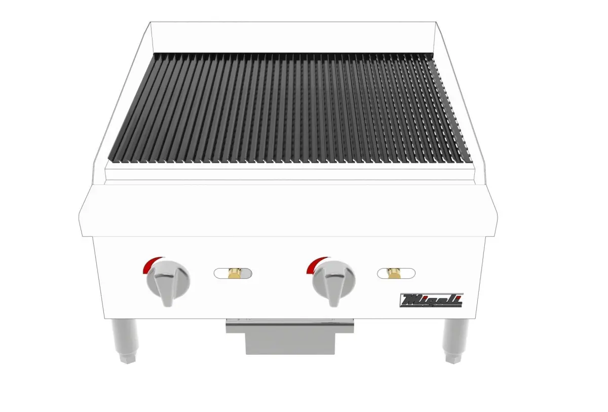 The Migali C-CB24 24″ wide, radiant broiler is excellent for grilling a variety of proteins and veggies. This model incorporates heavy-duty, cast iron, reversible cooking grates with angled sides for flat or sloped positions. Migali “U” shape burners are robust, creating an even temperature across the radiant surface. Finally, the C-CB24 is also eye catching, boasting a high polished stainless steel exterior and interior, (2) chrome temperature knobs and stainless steel adjustable legs.UPC 819296020636Exterior Width 24Exterior Depth 27.6Exterior Height 15.2Weight 117 lbsShipping Width 26.8Shipping Depth 29.9Shipping Height 18.2Shipping Weight 147 lbsNumber of Burners 2Total BTU 70000Power Type Natural Gas / Liquid PropaneControl Type ManualIgnition ManualValve Type Pilot LightBurner BTU 35000Working Area 23.9″ w x 20.2″ dIntake-tube Pressure (W.C.) Natural Gas 4Intake-tube Pressure (W.C.) LP 10Nozzle NumberNatural Gas #36Nozzle NumberLP #50Gas Inlet Size 3/4″Number of Controls 2