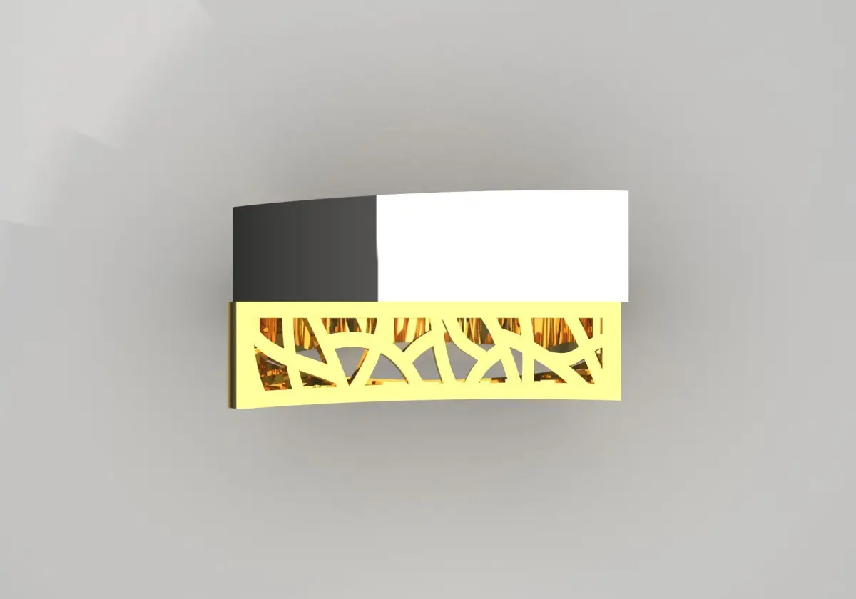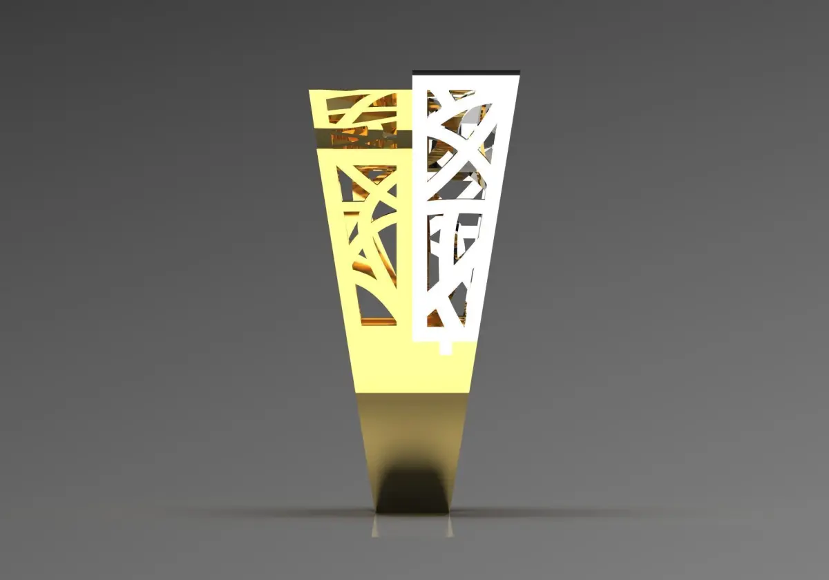 The ring in the picture has a modern and unique design, made of two different colors of gold and intricate patterns. The ring has a bold structure with a geometric shape that draws visual attention. It is made of two different types of gold: one is shiny white gold, and the other is sparkling yellow gold. The left side of the ring has a smooth and flat surface, while the other side shows an intricate lattice design in yellow gold that gives it a sense of lightness and transparency. The polished surfaces reflect light beautifully, adding to the modern appeal of the ring. Overall, this ring balances boldness and softness, making it a perfect eye-catching piece for those who love modern jewelry.