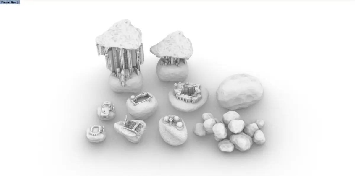 10 piece asteroids with and without buildings and settlements for tabletop space games. Realistic celestial bodies, clustered, singular, dug and even joined pieces. Includes industrial, military and residental buildings and complexes. Miniature space rocks suitable for wargaming, decoration/collection, painting/weathering, dioramas and kitbashing. Comes with prop base to keep them 'afloat'.