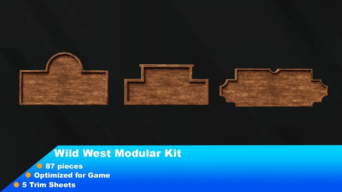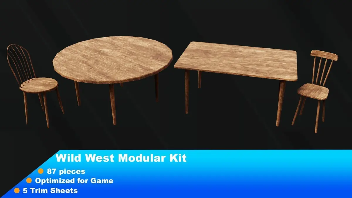 The Wild west modular packIf you want to build a city or village in the wild western age both interior and exterior this package is perfect for your game project.In this kit, you will find 87 pieces including:⦁ 3 Building Crowns⦁ 2 Chairs⦁ 2 Tables⦁ 2 Columns⦁ 8 Doors⦁ 24 Exterior Walls⦁ 3 Font Door Step and Ramps⦁ 2 Interior Floors⦁ 9 Interior Walls⦁ 8 Stairs⦁ 7 Wooden Logs⦁ 2 Roof Tiles⦁ 1 Outdoor Shade⦁ 8 Windows⦁ 4 Wooden Fences⦁ 1 Big Water Tank⦁ 1 Windmill