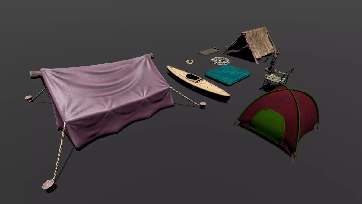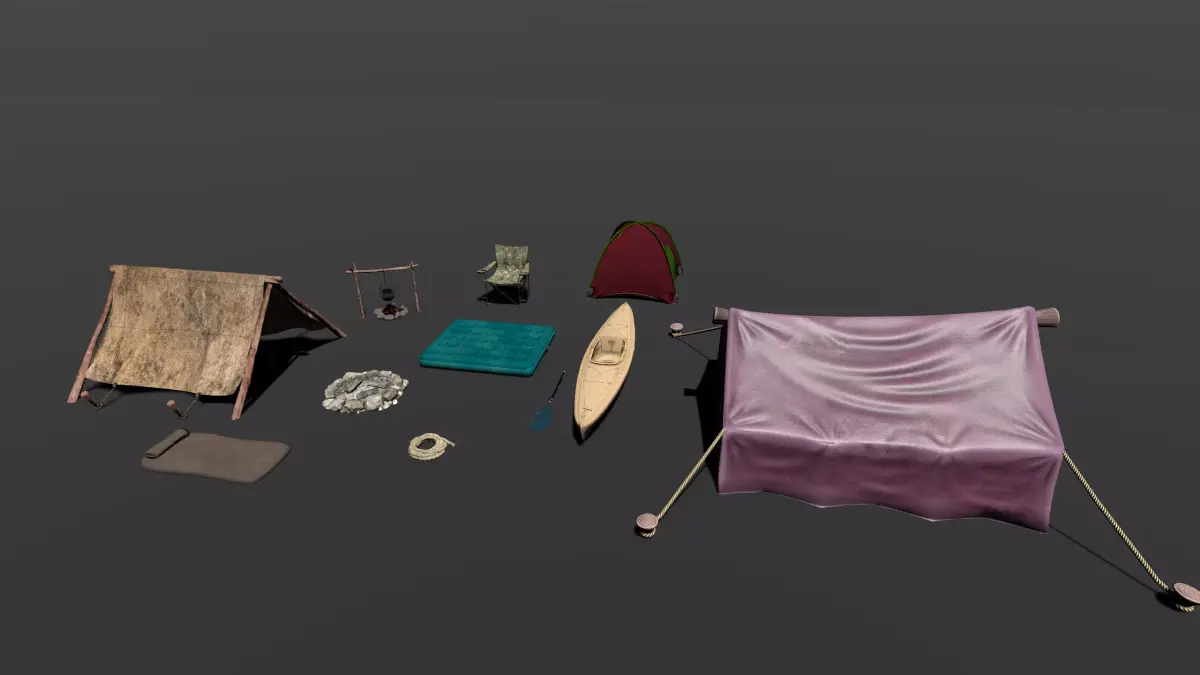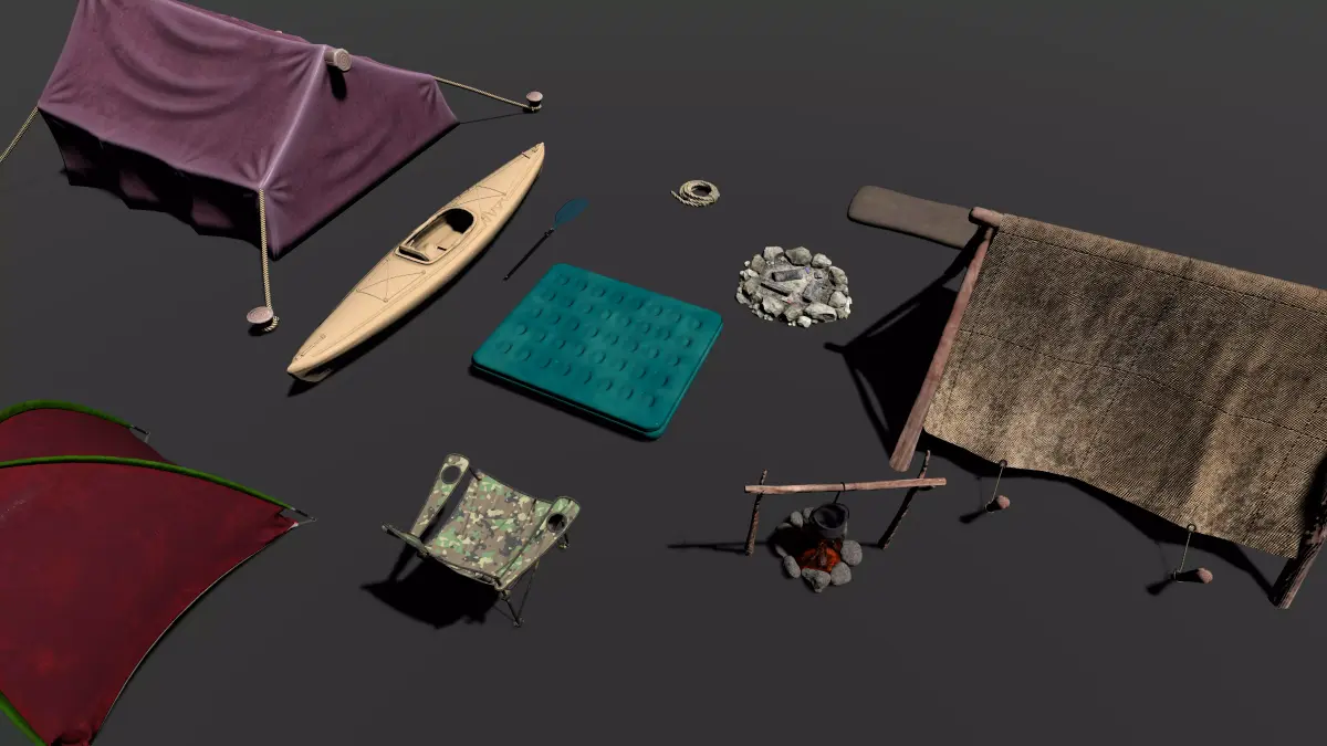 Overall, the composition reads as a complete outdoor campsite kit, thoughtfully curated for extended stays in nature. It conveys themes of exploration, preparedness, and harmony with the natural environment, making it suitable for use in a survival game, outdoor simulation, or visual reference for camping and wilderness scenarios.
