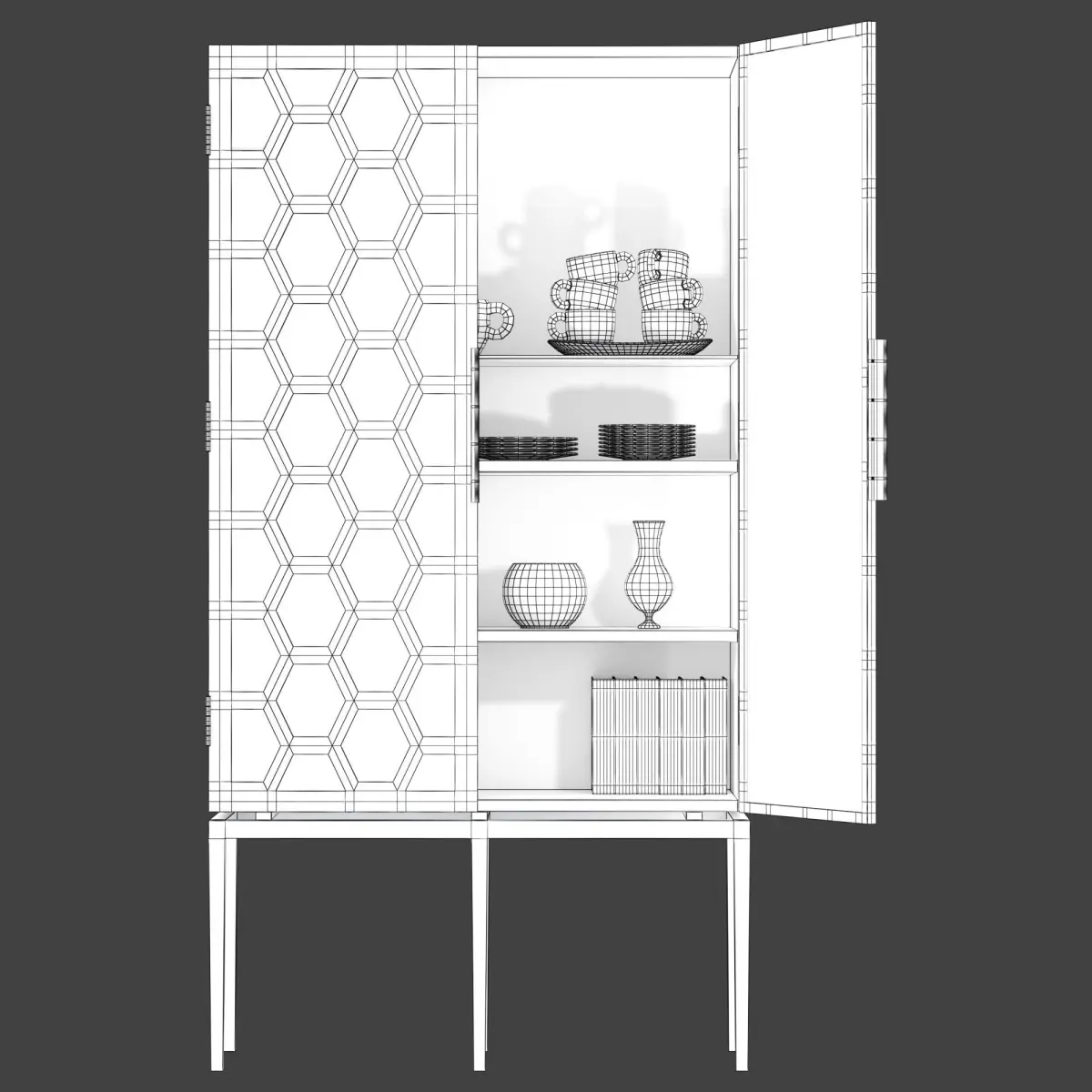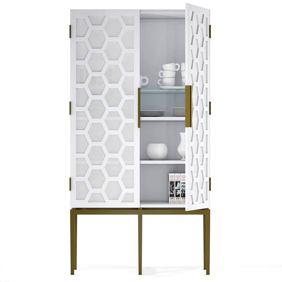 Dimensions:Overall W36 x D17 x H68Door: W18 x H50Interior: W34 x D15 x H483 ShelvesClosed BackShelves: W34 x D135. x H1 - 2 wood / 1 glassFloor Clearance: H16.25Handle W3/8 x D.5 x H10