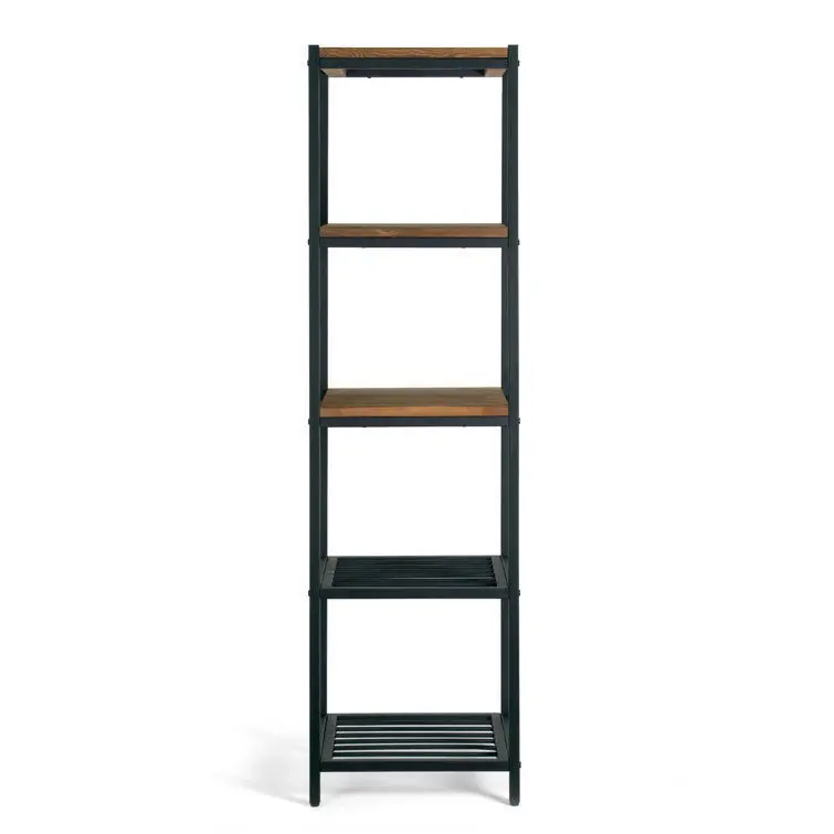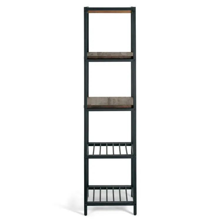 - Bring a streamlined industrial style to your space with this etagere bookcase. Crafted of sturdy iron in a matte black finish, this bookcase’s slender frame features ladder sides and an open backing