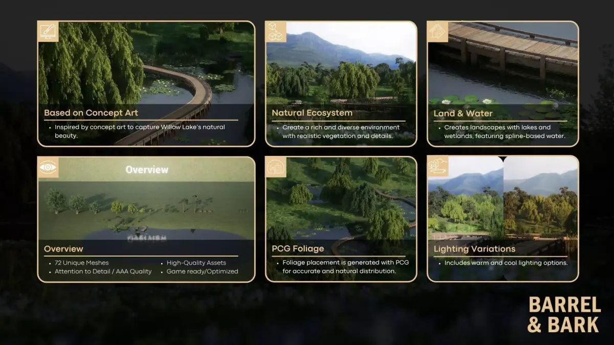 Need a calm, nature-filled space for your next scene? I’ve followed the trail and found just the place!This realistic Willow Lake Biome Environment Pack captures the peaceful charm of a lakeside setting—lush willow trees, still waters, and a wooden boardwalk winding through vibrant greenery. It’s ready to drop into your Unreal Engine project and bring the outdoors to life.