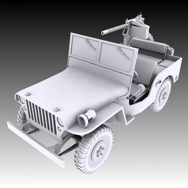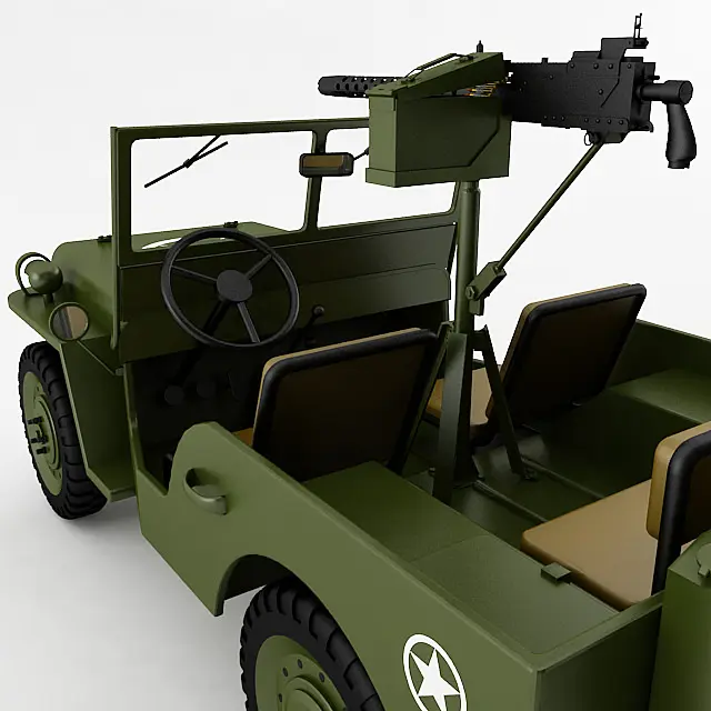 Collection includes high poly 3d models of a Willys Jeep, M1919 .30 Caliber Machine Gun on a M31C Pedestal Mount, and a T3 Trailer. All models utilize procedural materials and include both a Vray and Standard material set.