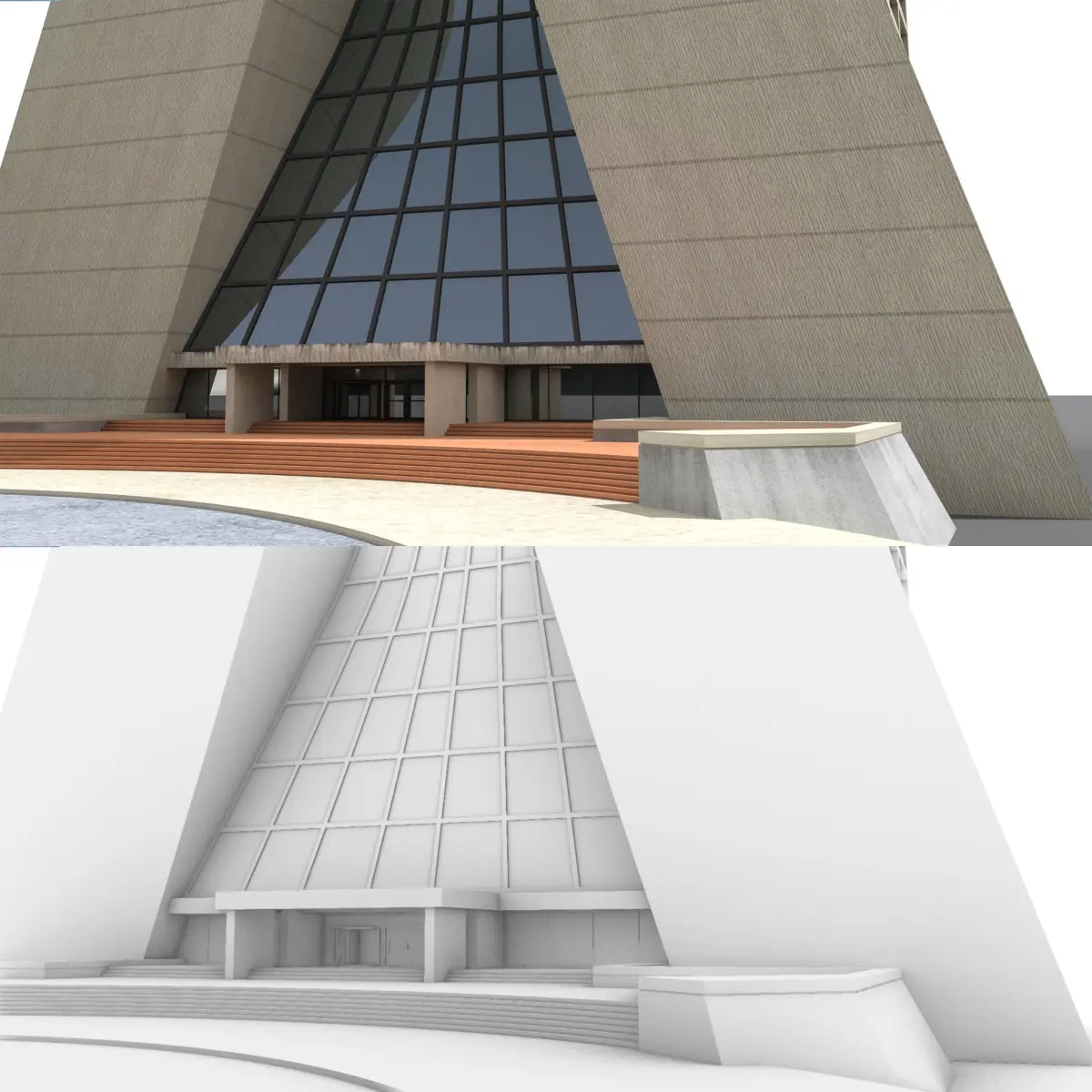 The 3D model is based on photos references of the real world Wilson Hall Fermilab building's exterior. It was created with approximate dimensions.