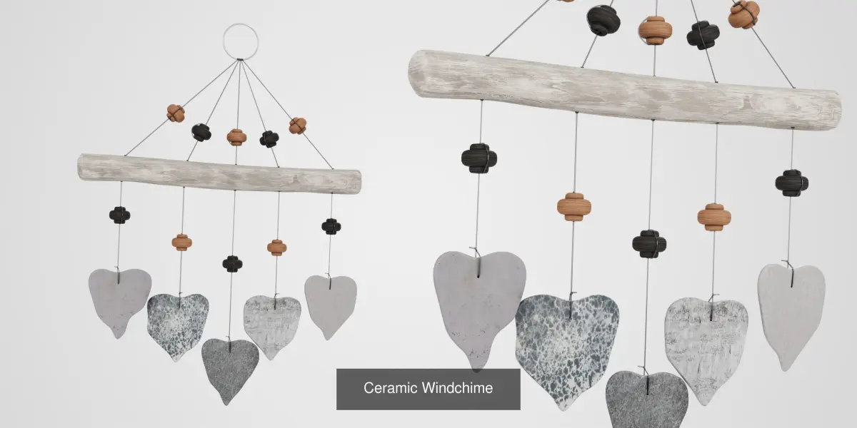 Bring the beauty and tranquility of wind chimes to your outdoor space with this collection of handcrafted beauties. Each chime is unique and features its own set of intricate symbols and designs, adding a touch of whimsy and charm to your surroundings. As the wind blows, the chimes produce soothing and calming tones that will transport you to a peaceful Zen garden. Hang them in a sunny spot or outside in a gentle breeze to enjoy their calming melodies, and let the natural beauty of the chimes' craftsmanship add a stylish and unique touch to your surroundings. These 3D models are not only beautiful decorative pieces, but they're also versatile enough to be used in various projects, such as visualizations and animations. Imagine the collection of wind chimes enhancing the ambiance of your space and adding a touch of serenity to your daily life.