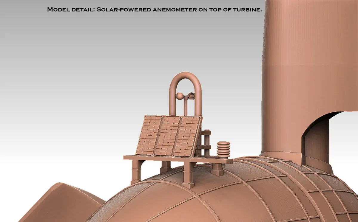 The default scale of (almost) all model parts included in this pack is roughly 6mm scale. Though you may want to alter the size of the models prior to printing to suit your specific needs. Also note that certain finer details, like the railing, will not print properly at the default scale unless you have a very high-quality printer. The tileset version of the turbine is prescaled to fit the default scale of the original tileset. Again, see link below.