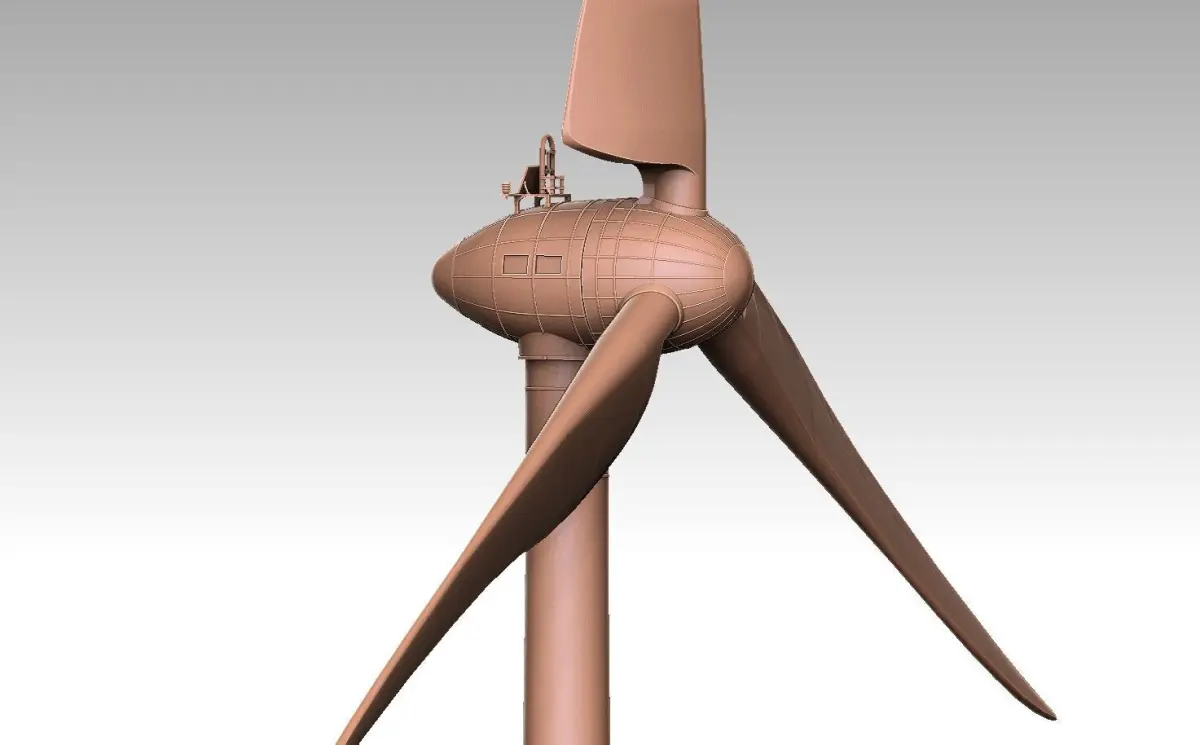 Wind Turbine. Modern, slightly steampunky design. I'm pretty sure it resembles a real-life type of turbine quite closely, ( E-82 EP2 E4 , manufactured by Enercon). But I can't guarantee it. I originally just drew the model based off of some generic images I found on the Internet.