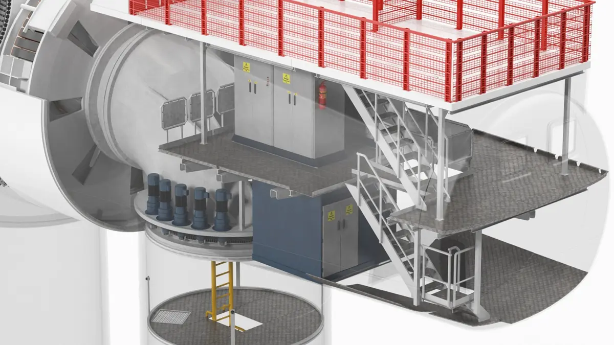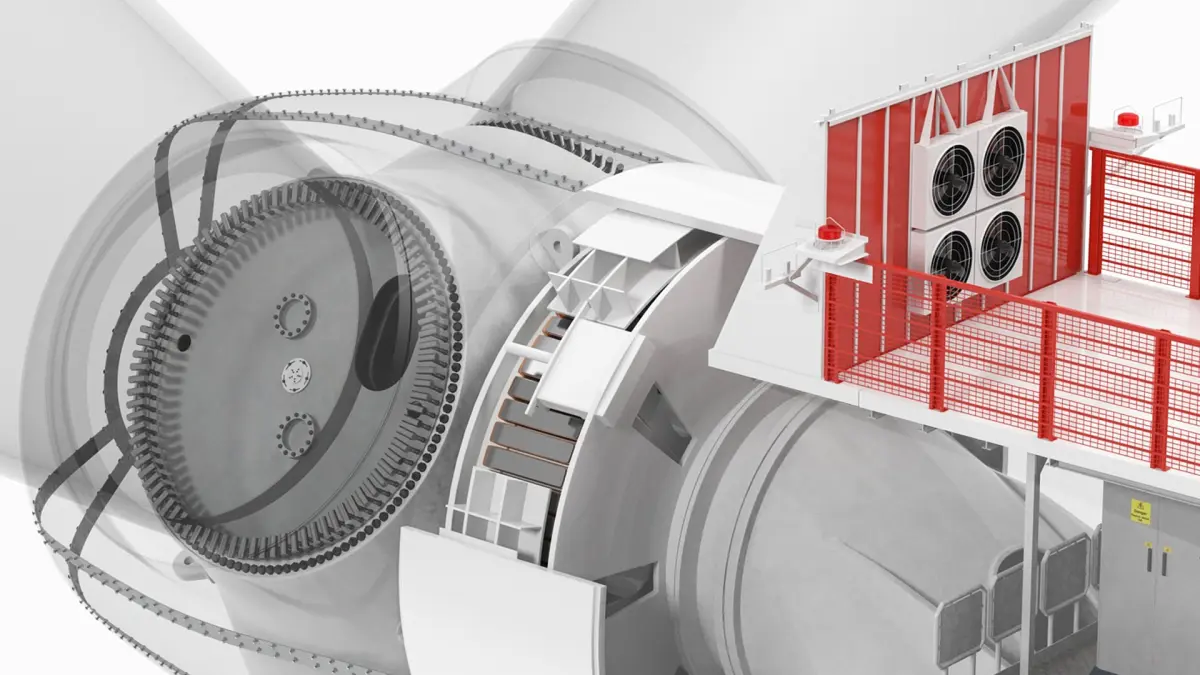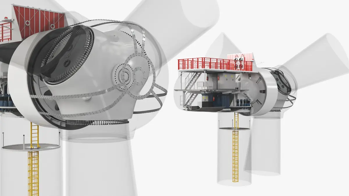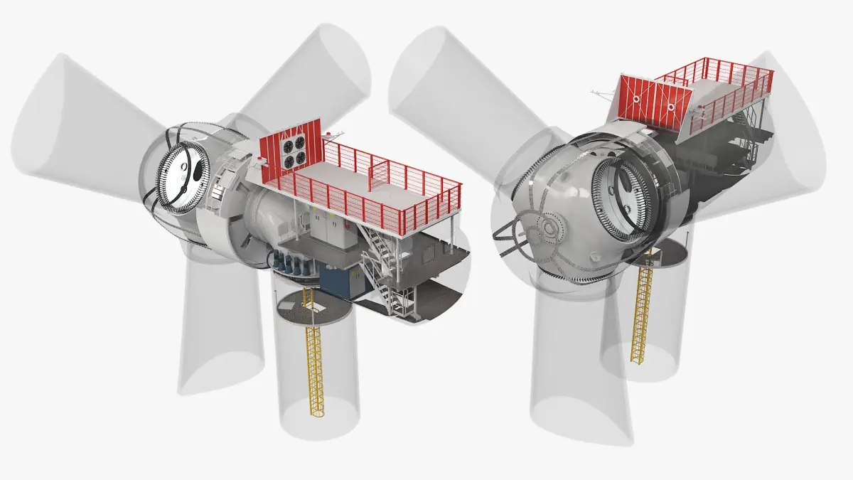 This detailed model illustrates the internal and external structures of the turbine's nacelle, including gear mechanisms, generators, and maintenance platforms. The model highlights the sophisticated design and functionality, emphasizing efficiency and accessibility for operations and maintenance.