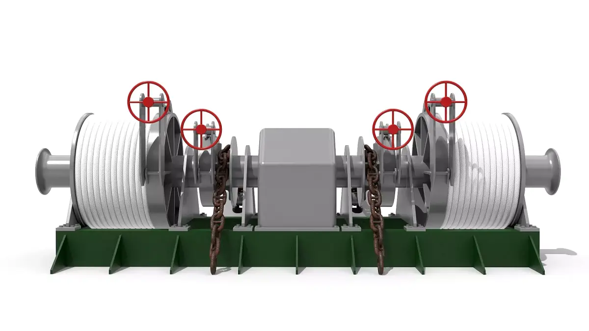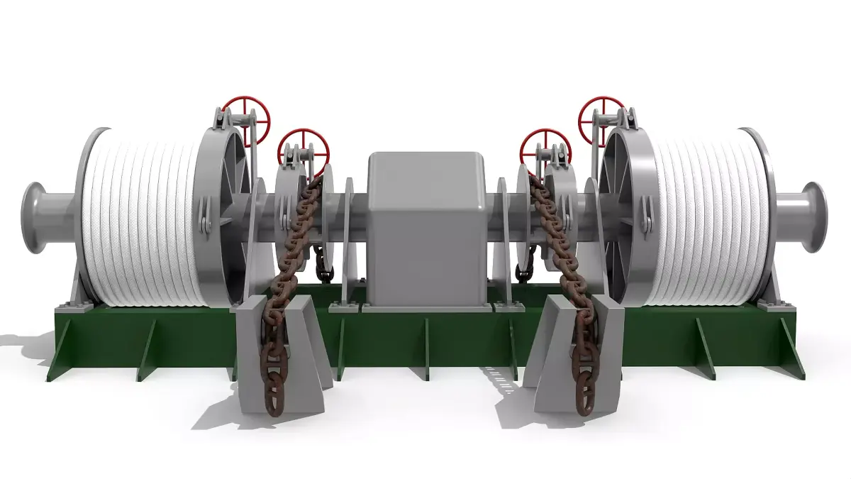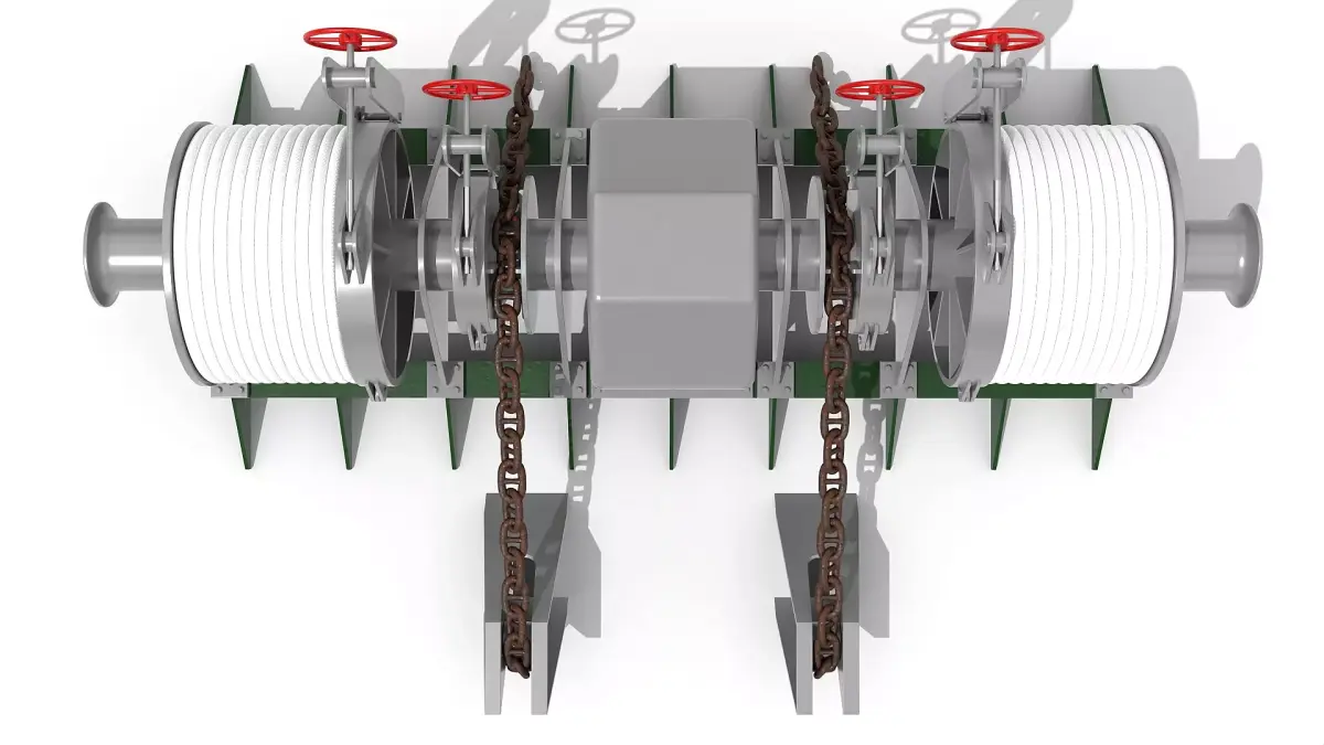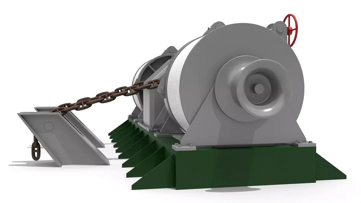 Detailed model of a windlass anchor / mooring winch incl. stud link anchor chain, scaled 1:1.
