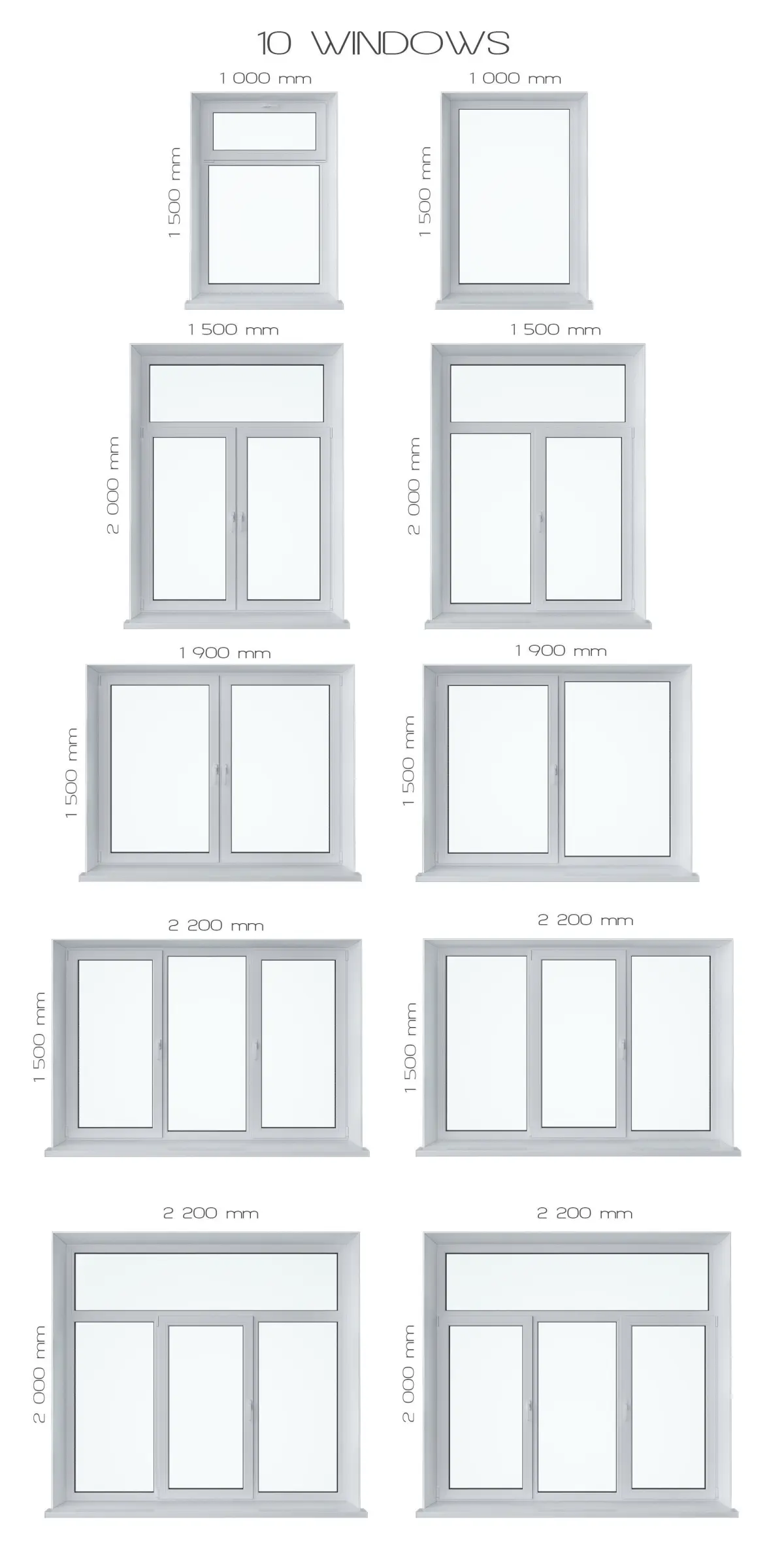 A set of windows of 10 doors and 6 materialsThe model is located in the center of coordinatesThe sizes of windows are edited