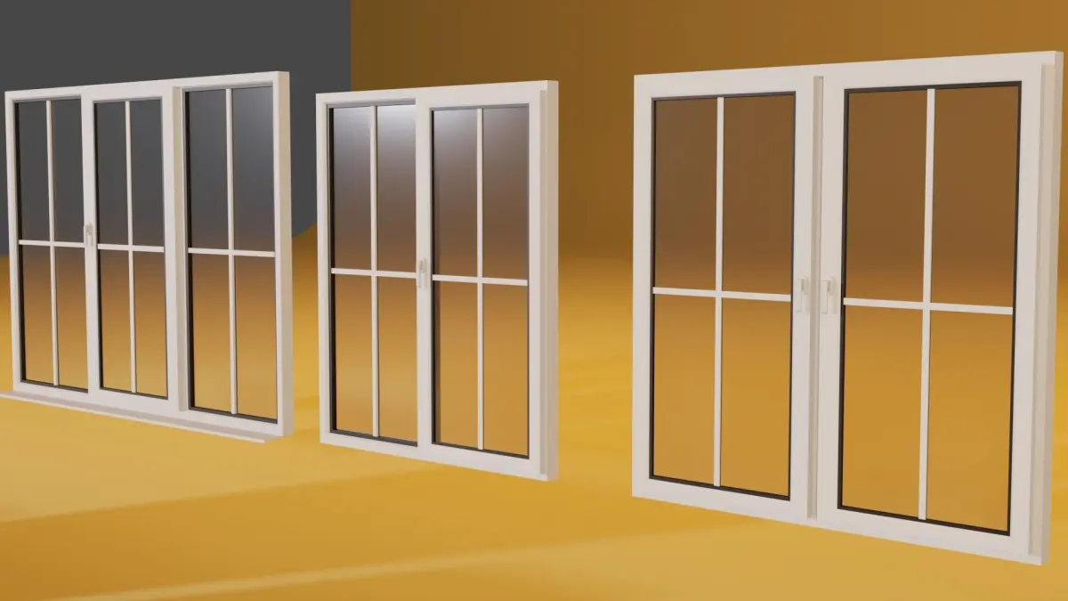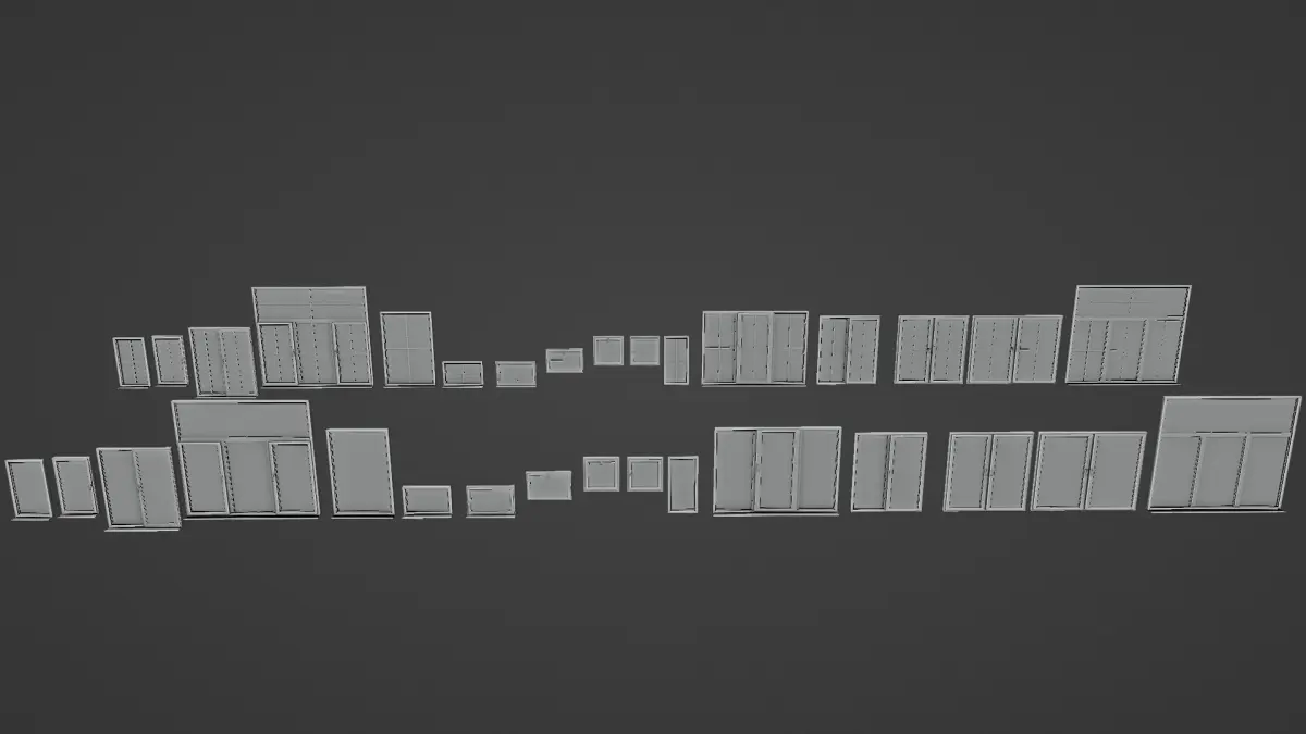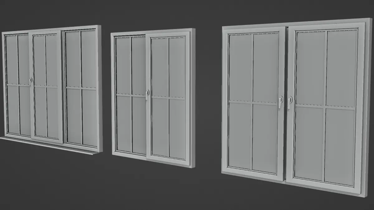 Plastic windows in different combinations, can be animated. So you don't need any uv and textures. Can be used to render in archviz