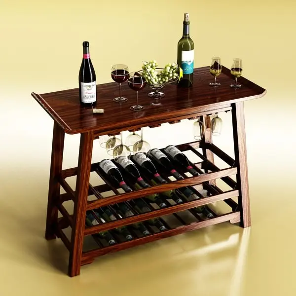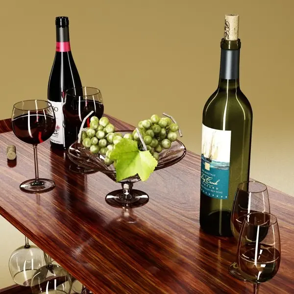 Photorealistic and High Detailed Wine Table Rack 2 and 2 Wine Bottles with Cork and Labels, 2 Wine Cups and Grapes Bowl.
