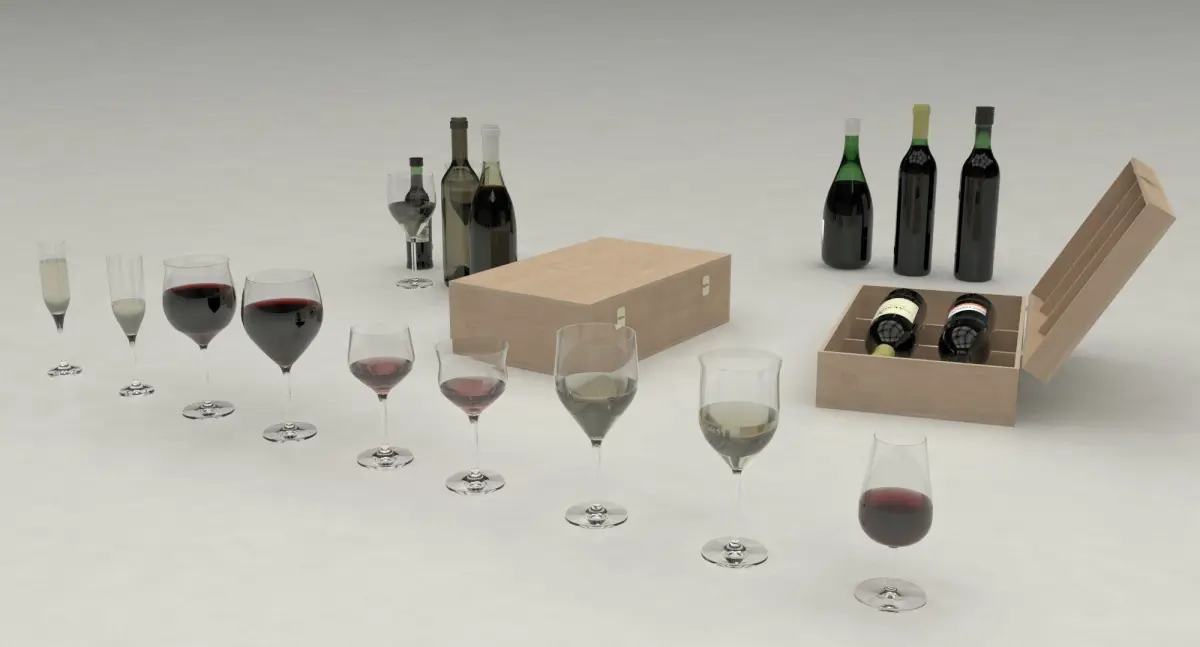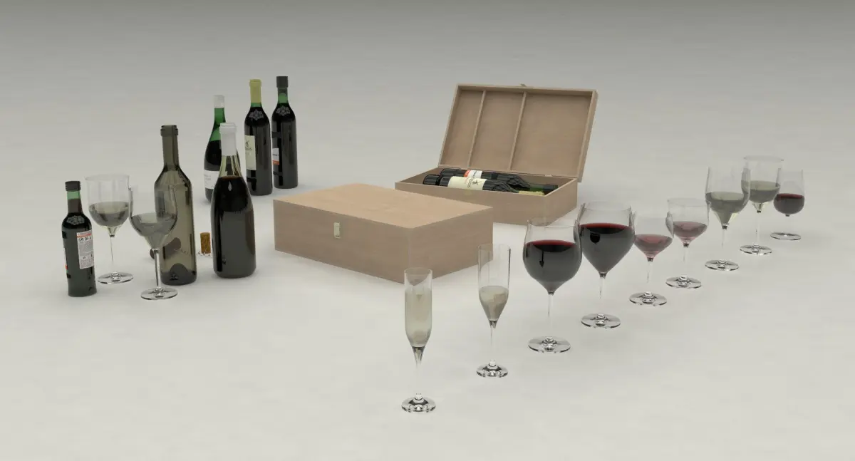 Here you will find collection of wine glasses, 4 wine bottles with etiquettes, wooden box for wines and accessories.