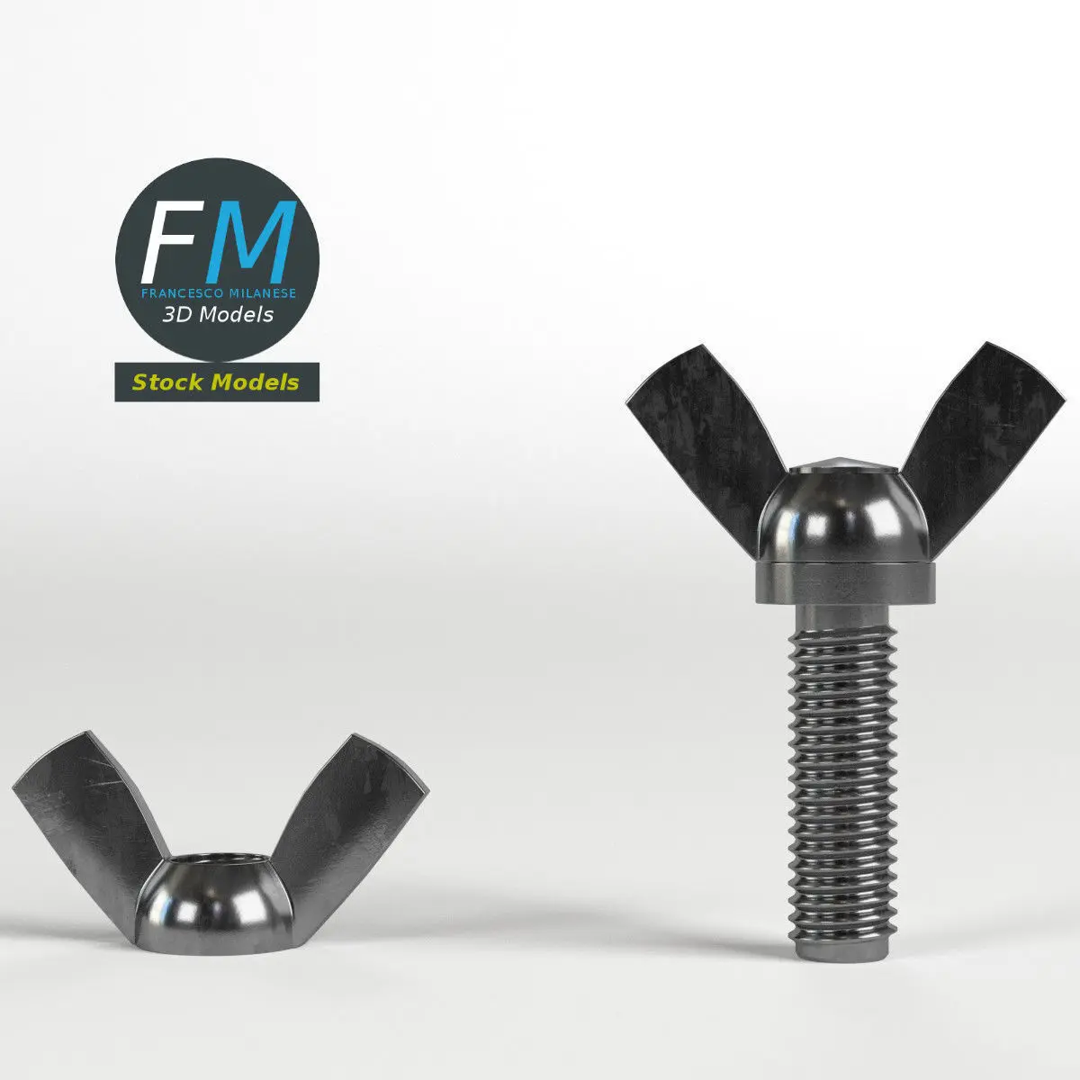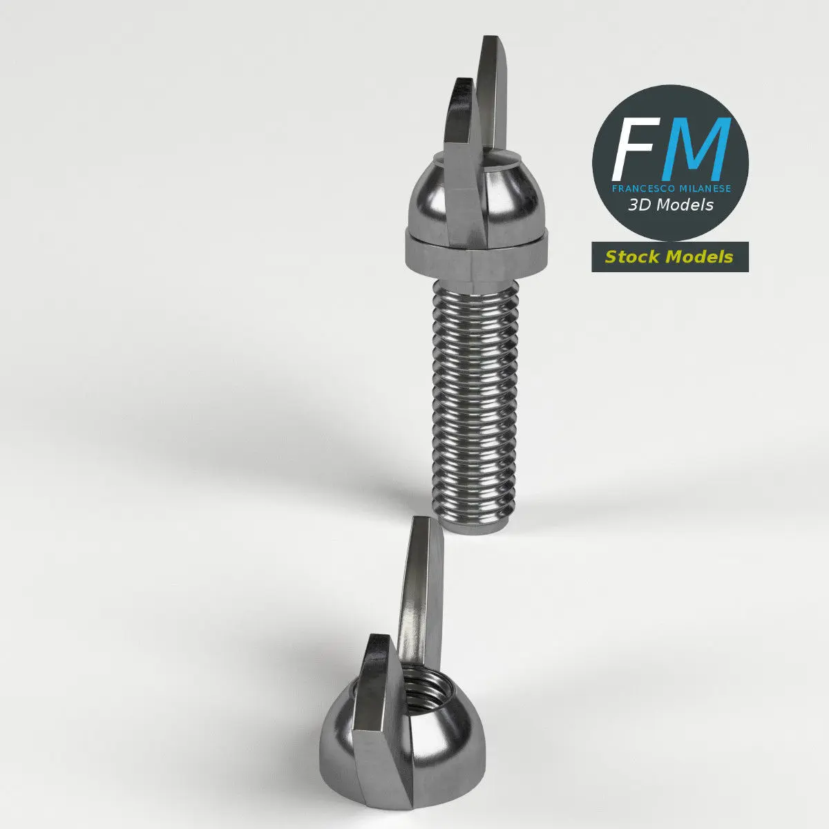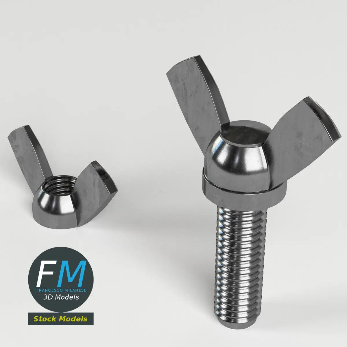 Wing nut and screw 3D Models. Two objects (wing nut, wing screw), each one with its own non overlapping UV Layout map, Material and PBR Textures set. Production-ready 3D Model, with PBR materials, textures, non overlapping UV Layout map provided in the package.Quads only geometries (no tris/ngons), no poles.Easily customizable: UV unwrapped geometries, so you can create new Textures (or modify the existing ones) using the UV Layout maps provided in the package (as png with alpha).Each Object, Material or Texture provided in the package has a unique, meaningful name.Made in Blender 3D 2.79 (Cycles materials) then exported to OBJ and FBX; materials and textures made in Substance Painter, exported for PBR, V-Ray, Unity, Unreal.PROMO IMAGES: the first image has been rendered in Cycles for Blender 3D 2.7x; in particular, you can find 11+ promo images in this description: