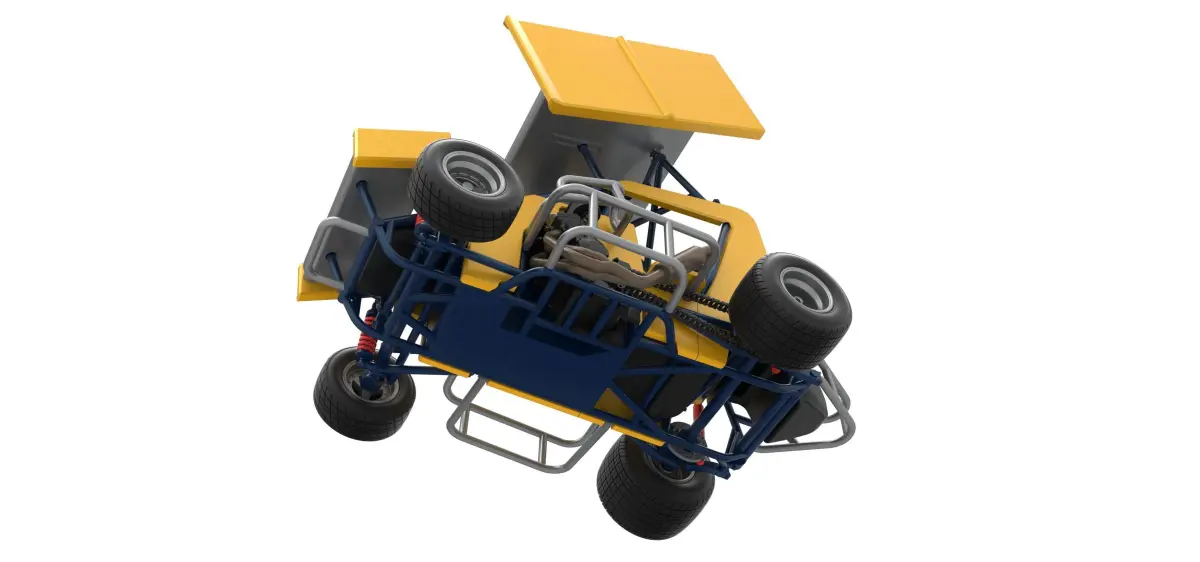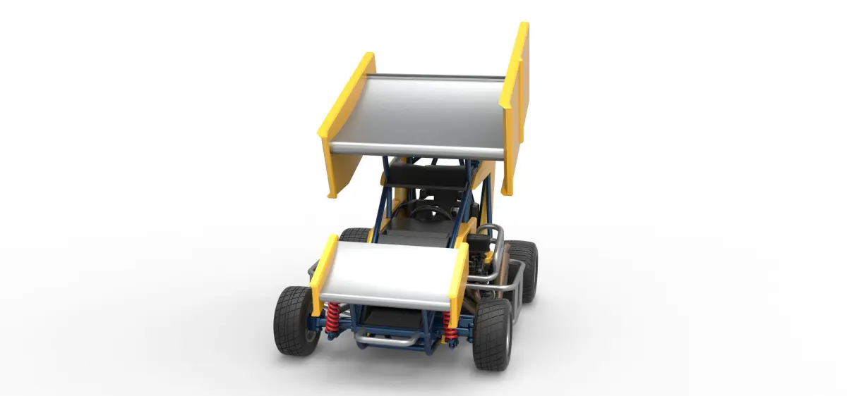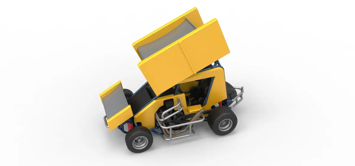 The model consists of parts: Air filter, Body, Engine, Exhaust pipes, Front rims, Front tires, Front wing, Hood, Left bumper 1,2, Main gear, Radiator, Rear left rim, Rear left tire, Rear right rim, Rear right tire, Right bumper, Rim covers, Seat part 1,2, Shell left part 1-3, Shell right part 1,2, Shifter, Spacer, Steering wheel, Tank, Top wing Central part, Top wing Left part, Top wing Right part, Visor.