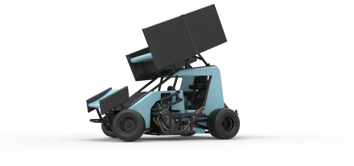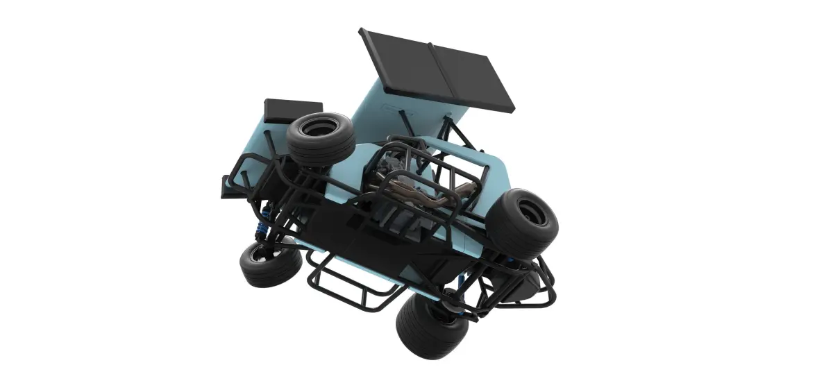The model consists of parts: Air filter, Body, Engine, Exhaust pipes, Front rims, Front tires, Front wing, Hood, Left bumper 1,2, Main gear, Radiator, Rear left rim, Rear left tire, Rear right rim, Rear right tire, Right bumper, Rim covers, Seat part 1,2, Shell left part 1-3, Shell right part 1,2, Shifter, Spacer, Steering wheel, Tank, Top wing Central part, Top wing Left part, Top wing Right part, Visor.