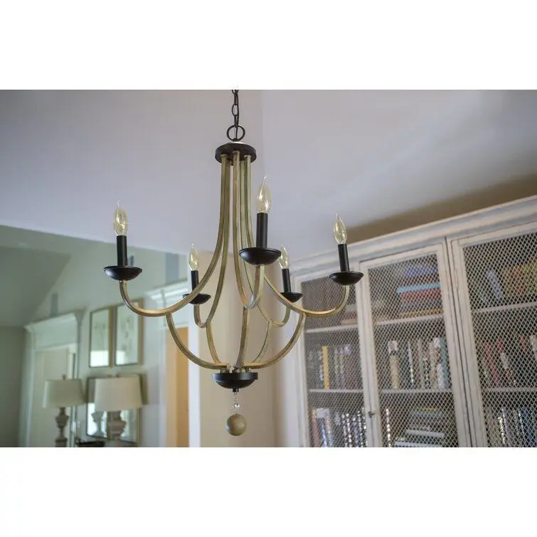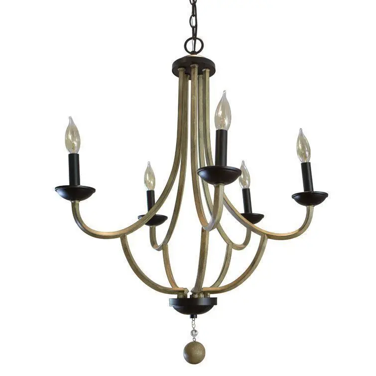 - This chandelier draws the eye and instantly transforms a room while keeping your dining room or breakfast nook light and airy. The classic shape of this wood and steel ceiling light is given a rustic makeover with the warmth of the natural wood construction. While the steel accents lend a modern element to this fixture and help create a look that is transitional and timeless.