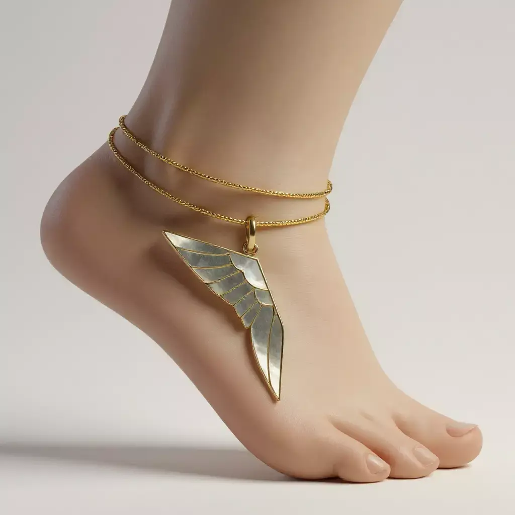 Wings of Selene” is a stunningly elegant anklet design inspired by the grace of flight and the shimmer of moonlight. This minimalist gold anklet features a delicate double-wrap chain and a pendant shaped like an abstract wing, inlaid with high-quality mother-of-pearl. The organic shine of the nacre creates an ethereal contrast with the smooth yellow gold, giving this piece a modern yet timeless appeal.
