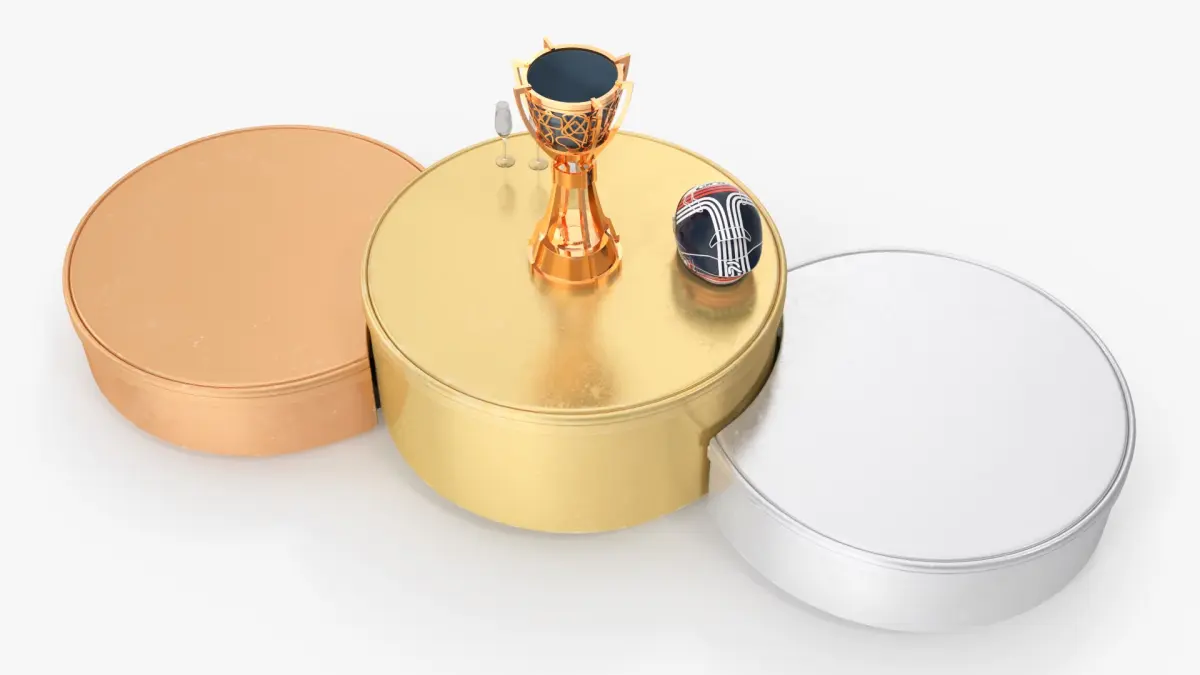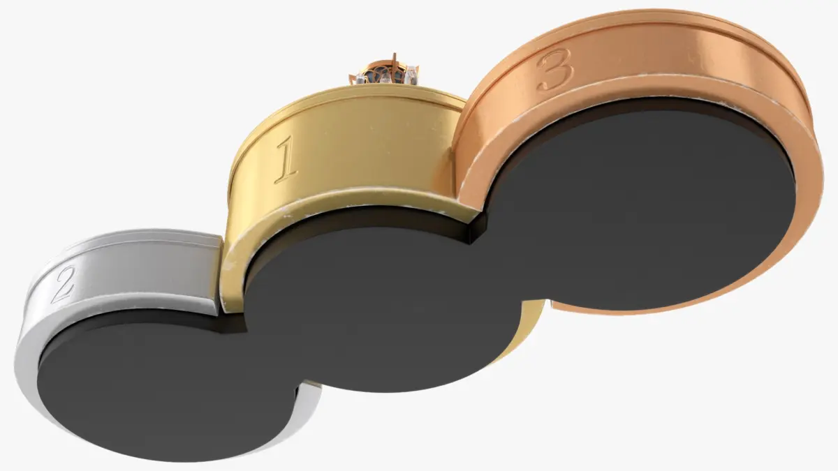 This model showcases three distinct levels, each representing first, second, and third places. The first-place podium features a trophy, helmet, and a bottle with glasses to capture the celebratory atmosphere. The sleek, metallic finish of each platform adds to the authenticity, making it perfect for illustrating victorious moments in sports.
