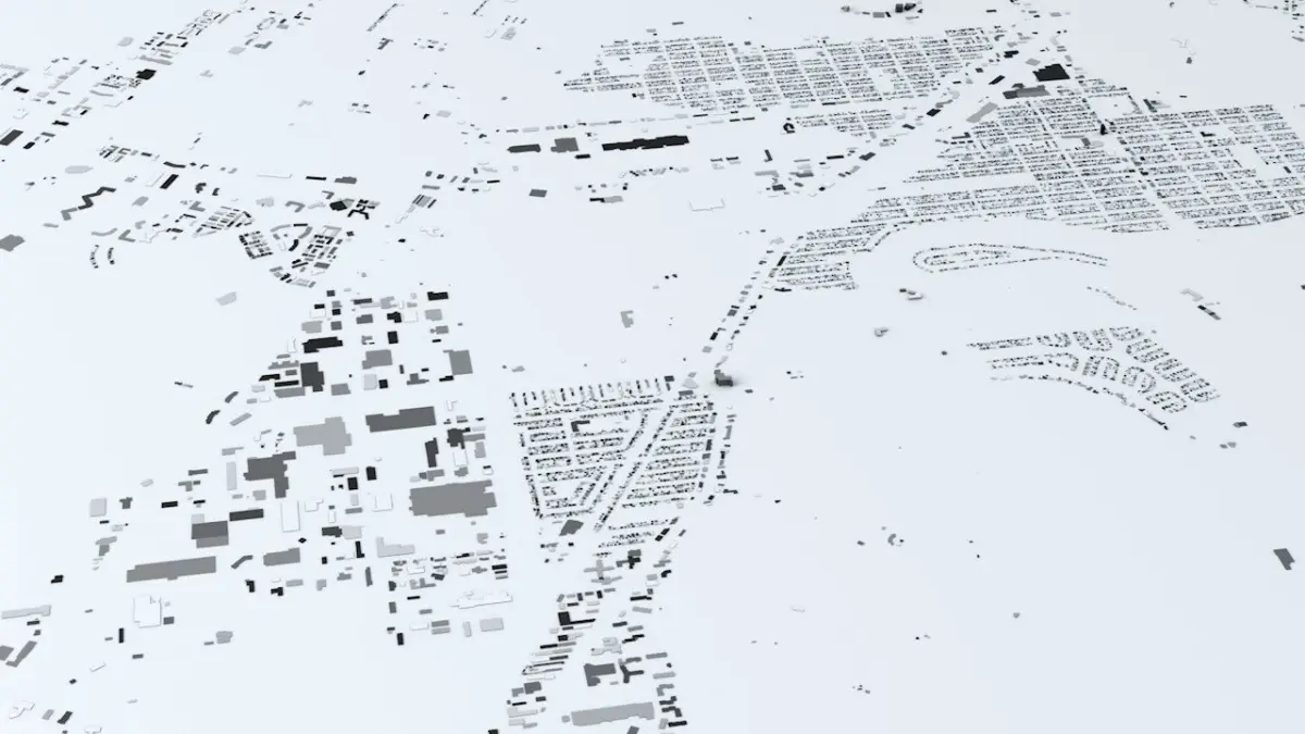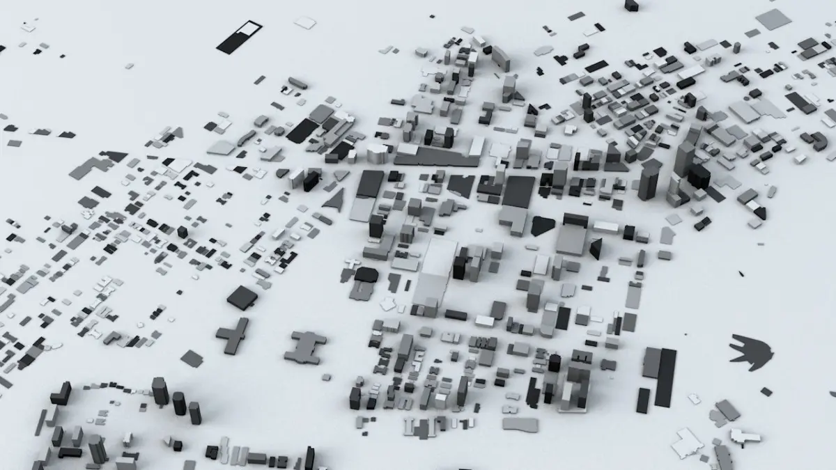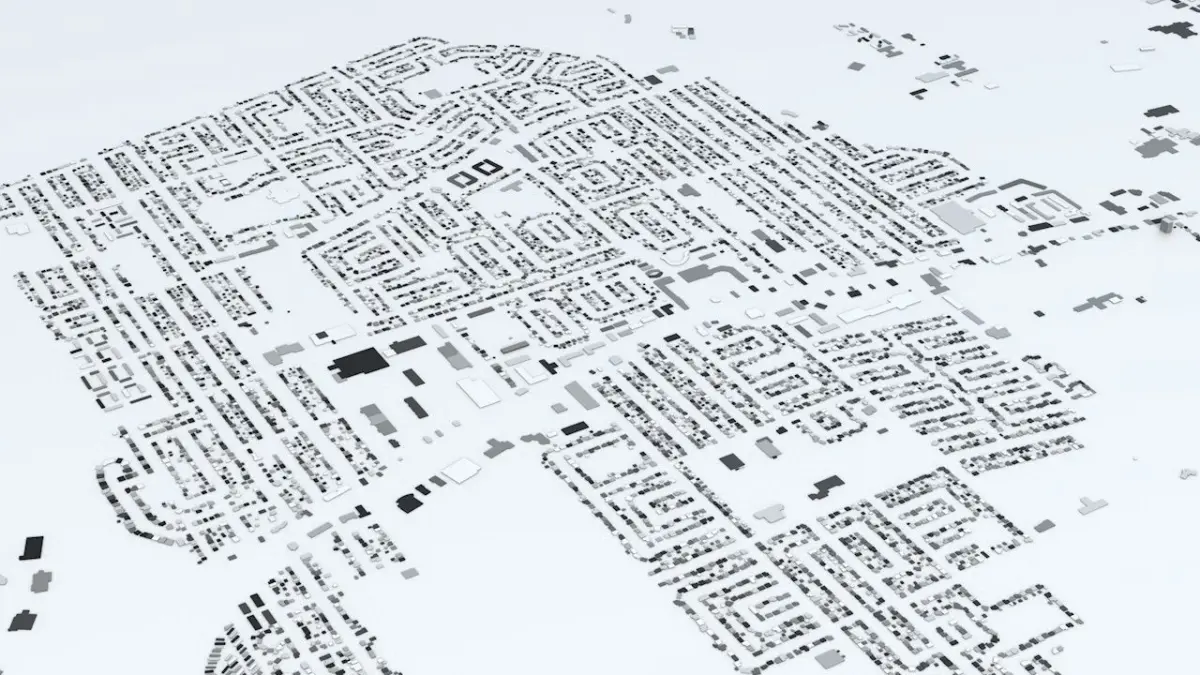 - the model is positioned on a flat surface (all buildings are on the “floor” - no elevation data included)