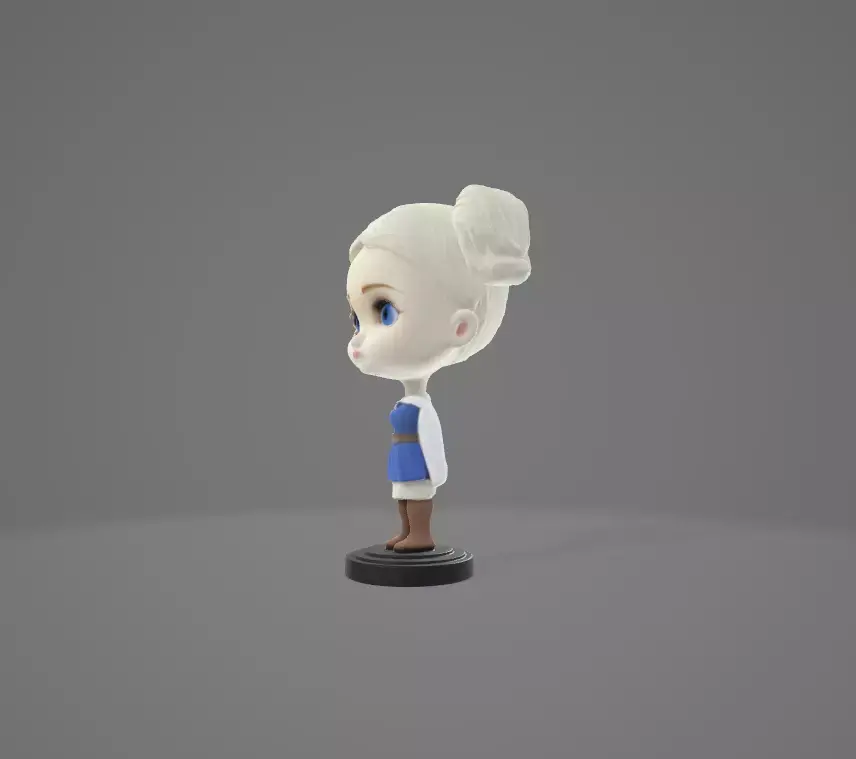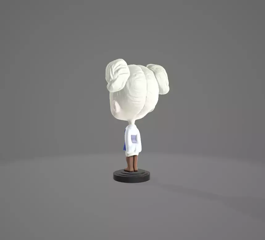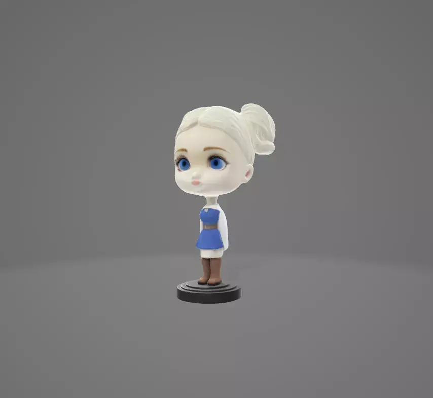 This stylized 3D bobblehead figurine features a charming winter-themed girl with oversized blue eyes, pale skin, and white hair styled in two playful buns. She wears a soft blue dress layered over a white long-sleeve shirt, paired with classic brown boots. Mounted on a sleek black circular base, her exaggerated proportions and cartoon-like design make her a delightful collectible. The subtle gray gradient background enhances her whimsical presence, making this bobblehead perfect for fans of fantasy characters, stylized art, or unique display pieces