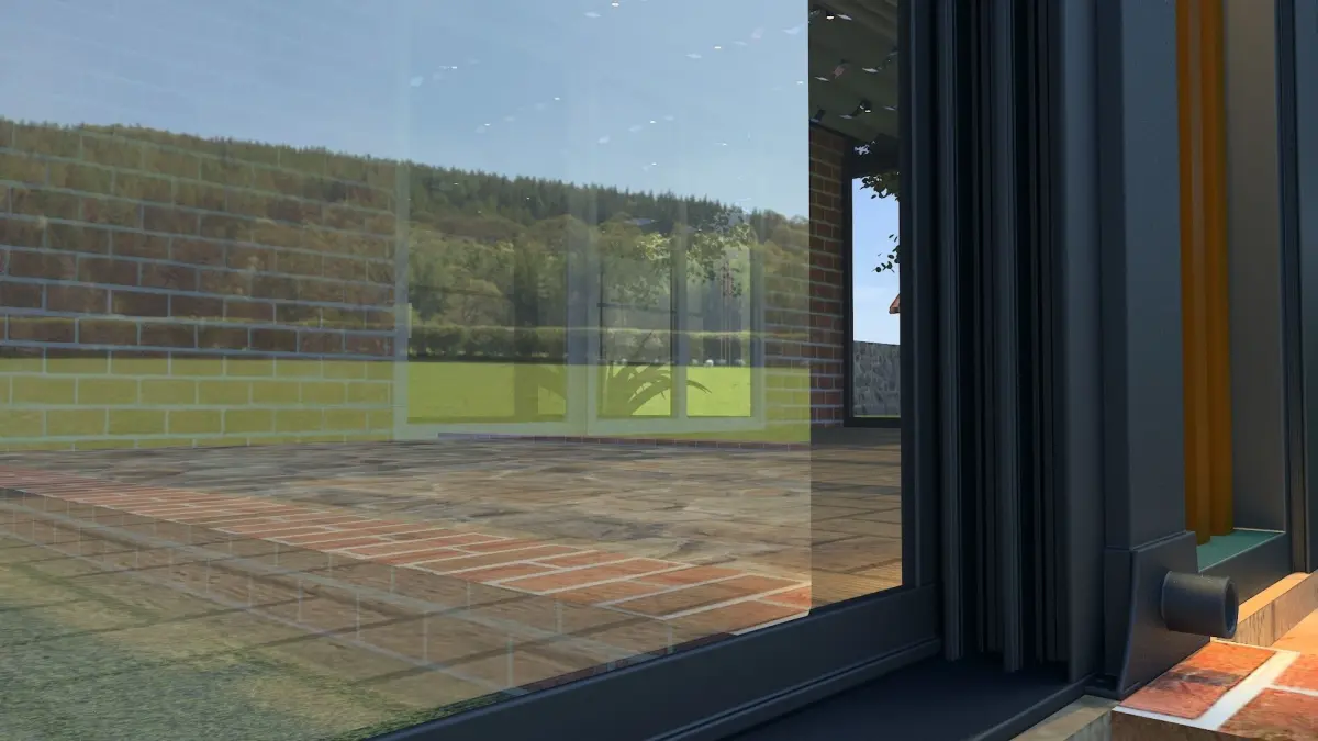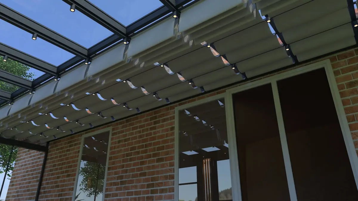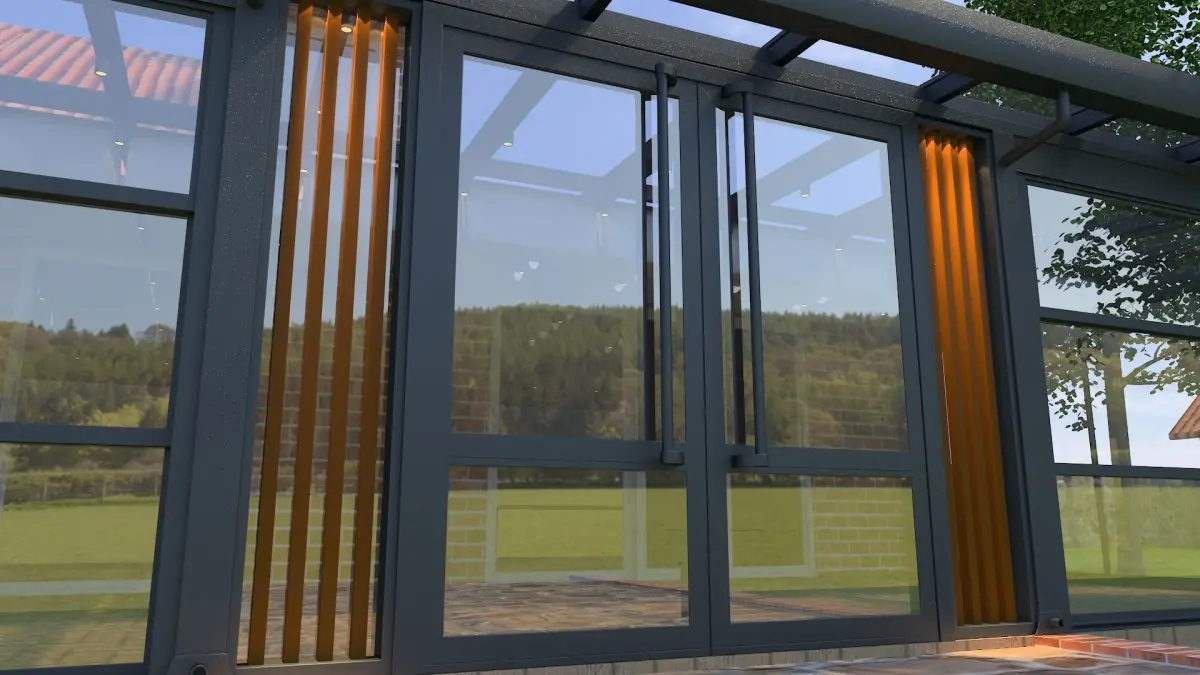 aluminum glass winter garden with all details with sliding glass on the sides and automatic glass on front the roof glass have automatic curtain all the aluminum profiles are real profiles and the color is Ral 7018 .