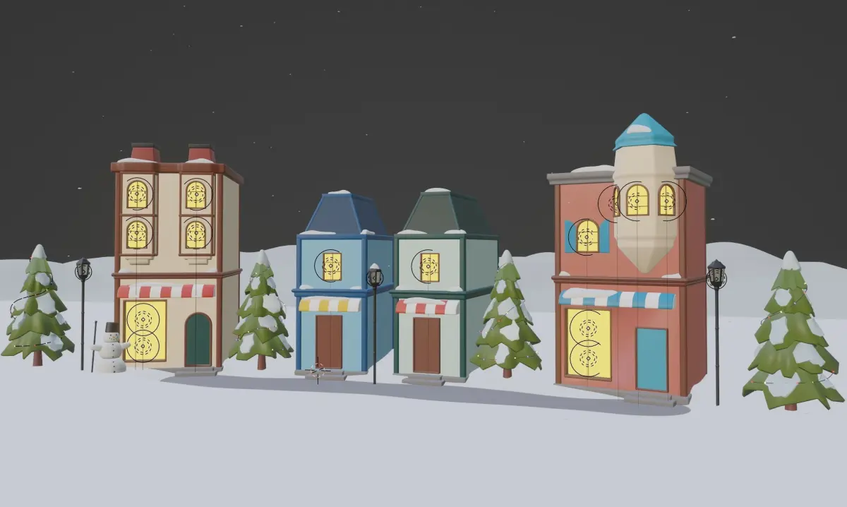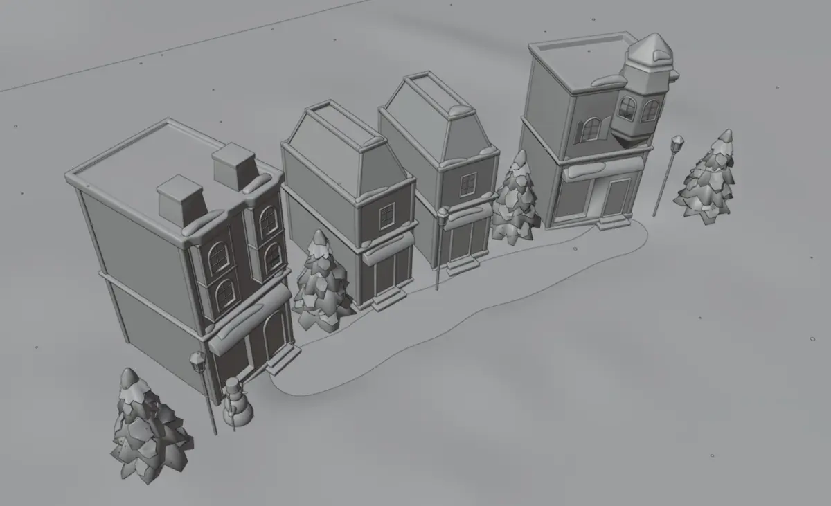 This is a 3D model of a town covered in snow with snowing animation made in Blender. Can be used as a christmas scene or just a winter street scene - christmas lights can be deleted if you want.