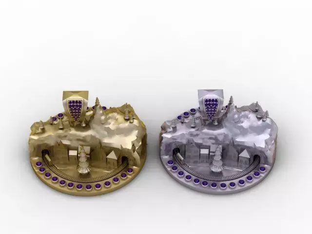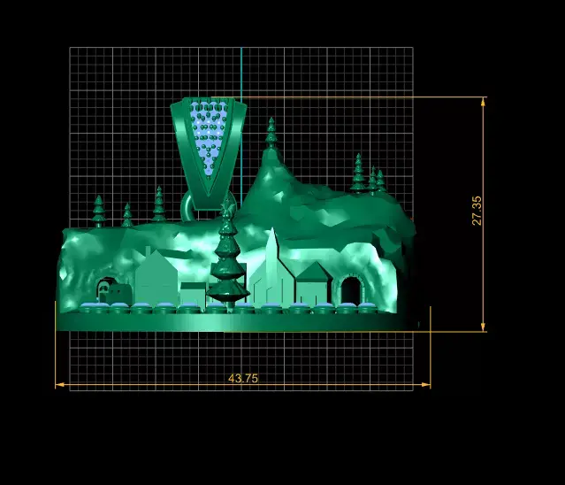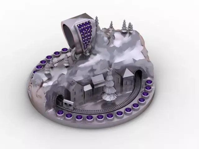 A breathtaking 3D printable winter village pendant featuring mountains, trees, tiny houses, a Christmas tree centerpiece, and a curved gemstone rail. Complete with a diamond-paved bail, this pendant is a miniature holiday masterpiece.