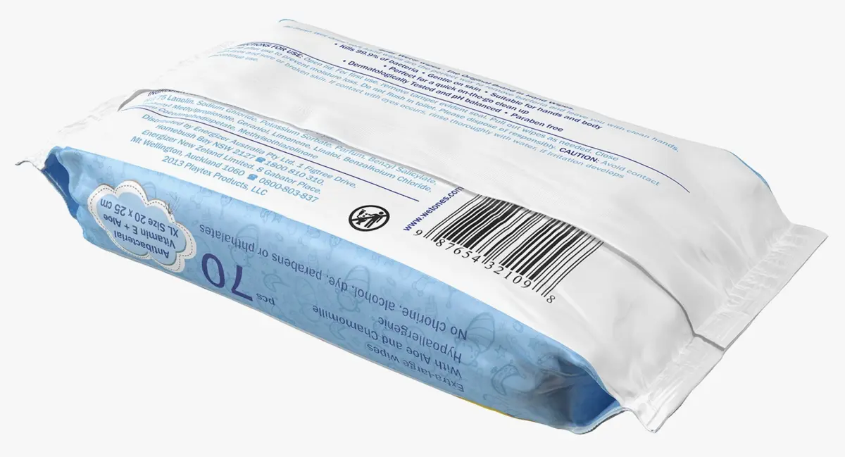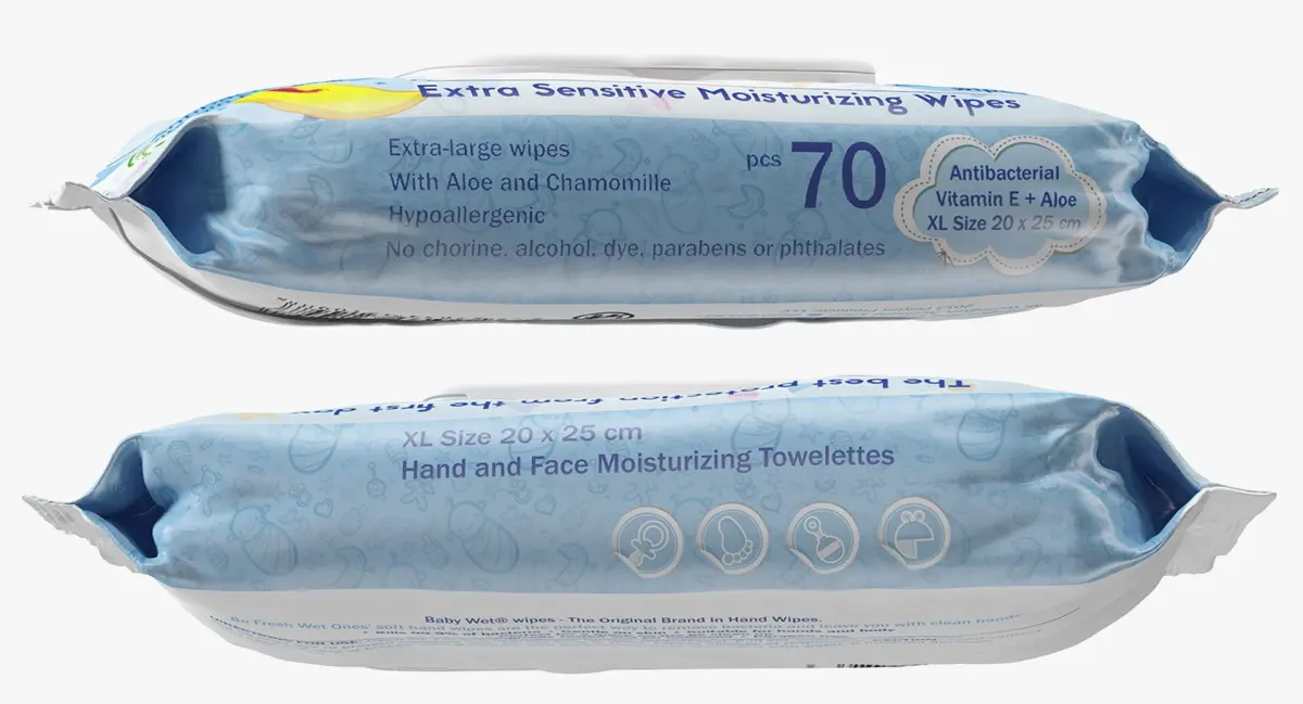 Modern napkin sized special material patches saturated with a scented skin cleanser in waterproof packages.