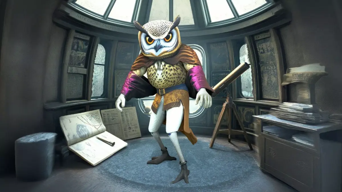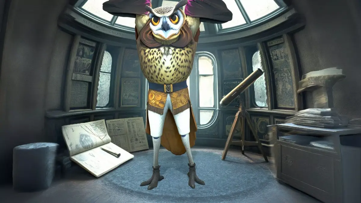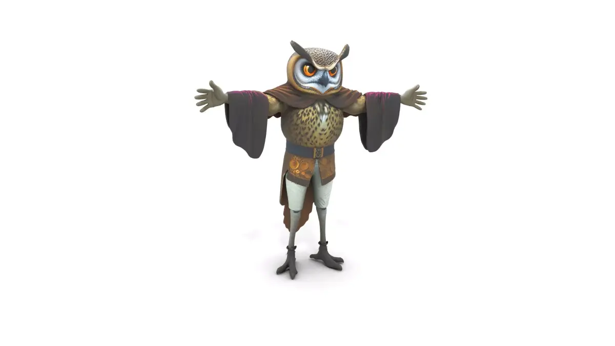 This model depicts a tall, wise owl character, complete with large amber eyes and round glasses, dressed in a luxurious velvet robe. It is designed for use in fantasy-themed projects, educational content, or storytelling environments. Each model has 3 levels of detail with QUAD polygons: