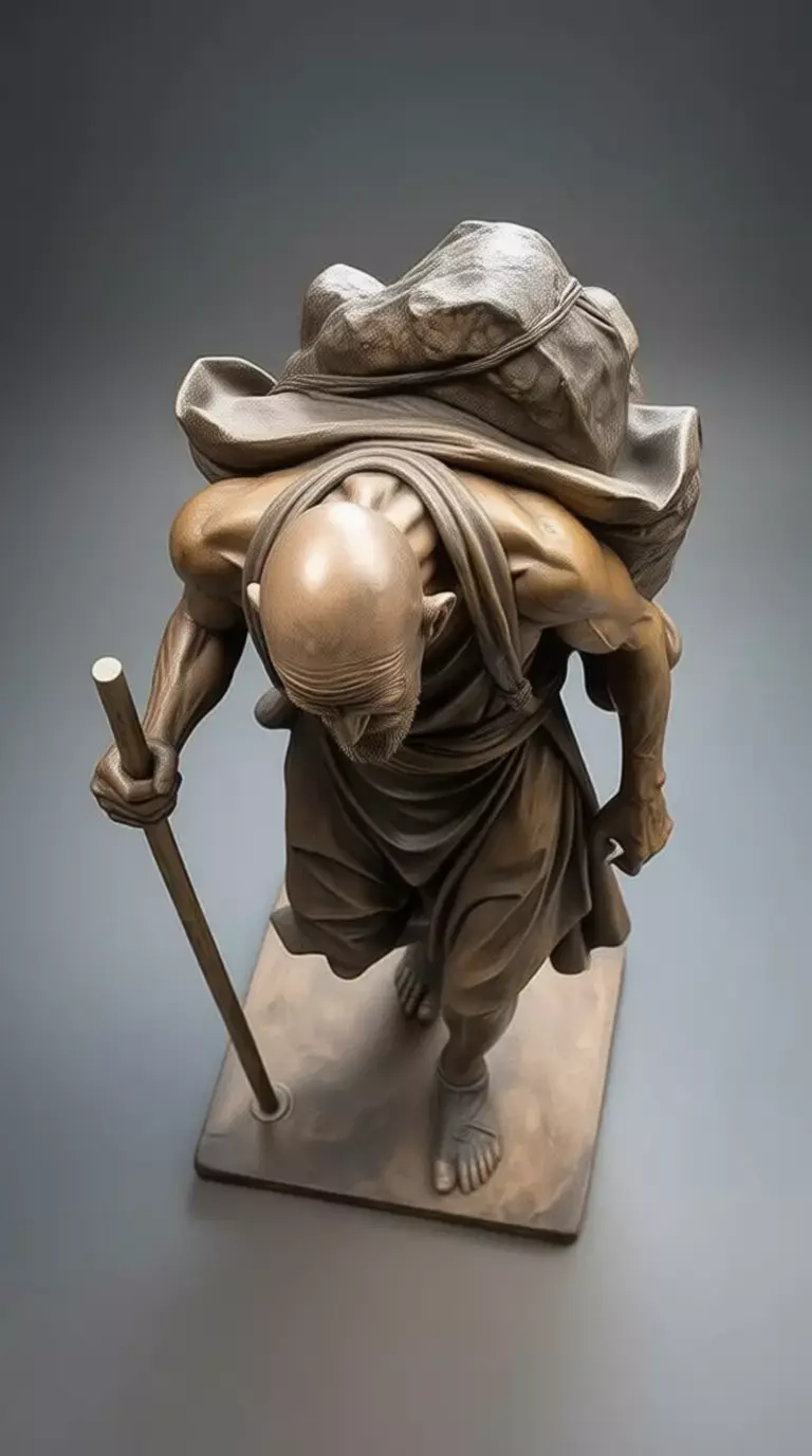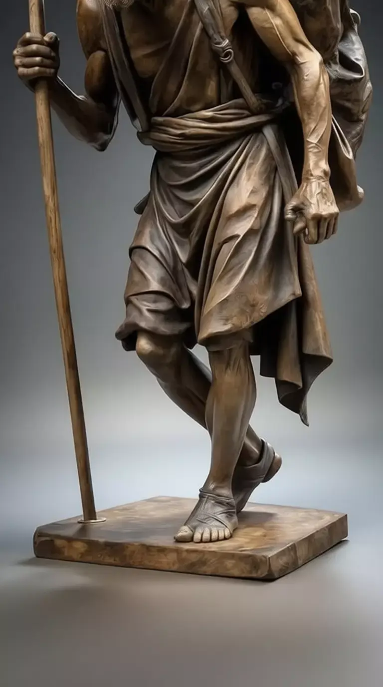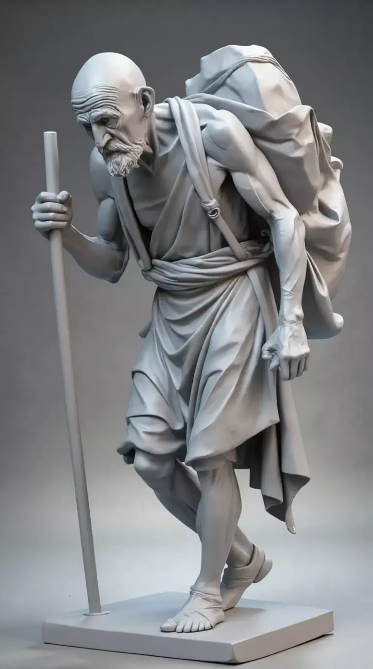 This 3D model captures the essence of timeless wisdom and journey through a meticulously crafted bronze sculpture of an aged pilgrim. The figure embodies resilience and introspection, with deeply weathered facial features, a flowing white beard, and pronounced musculature that speaks to a life of labor and travel. Clad in draped, textured robes, the elder leans on a sturdy wooden staff, his gaze fixed forward as if contemplating the path ahead. A large satchel slung over his shoulder adds to the narrative of pilgrimage, suggesting a burden carried with purpose.