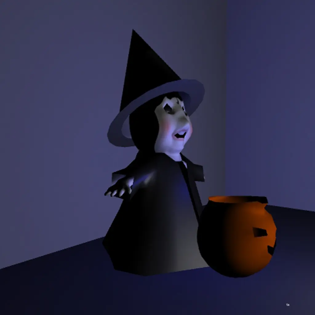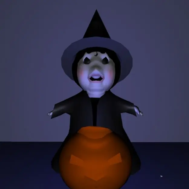 The little witch character is design for the Halloween. The character use the point light for the character and the blue ambient light for the dark environment.