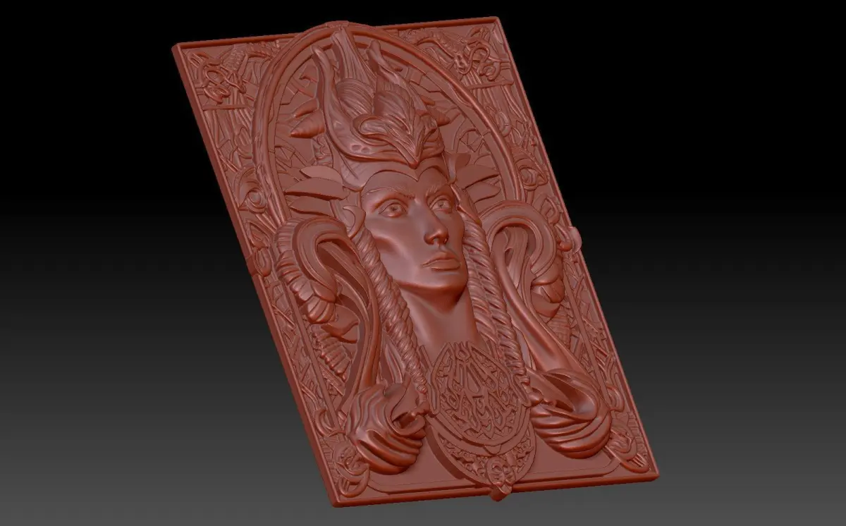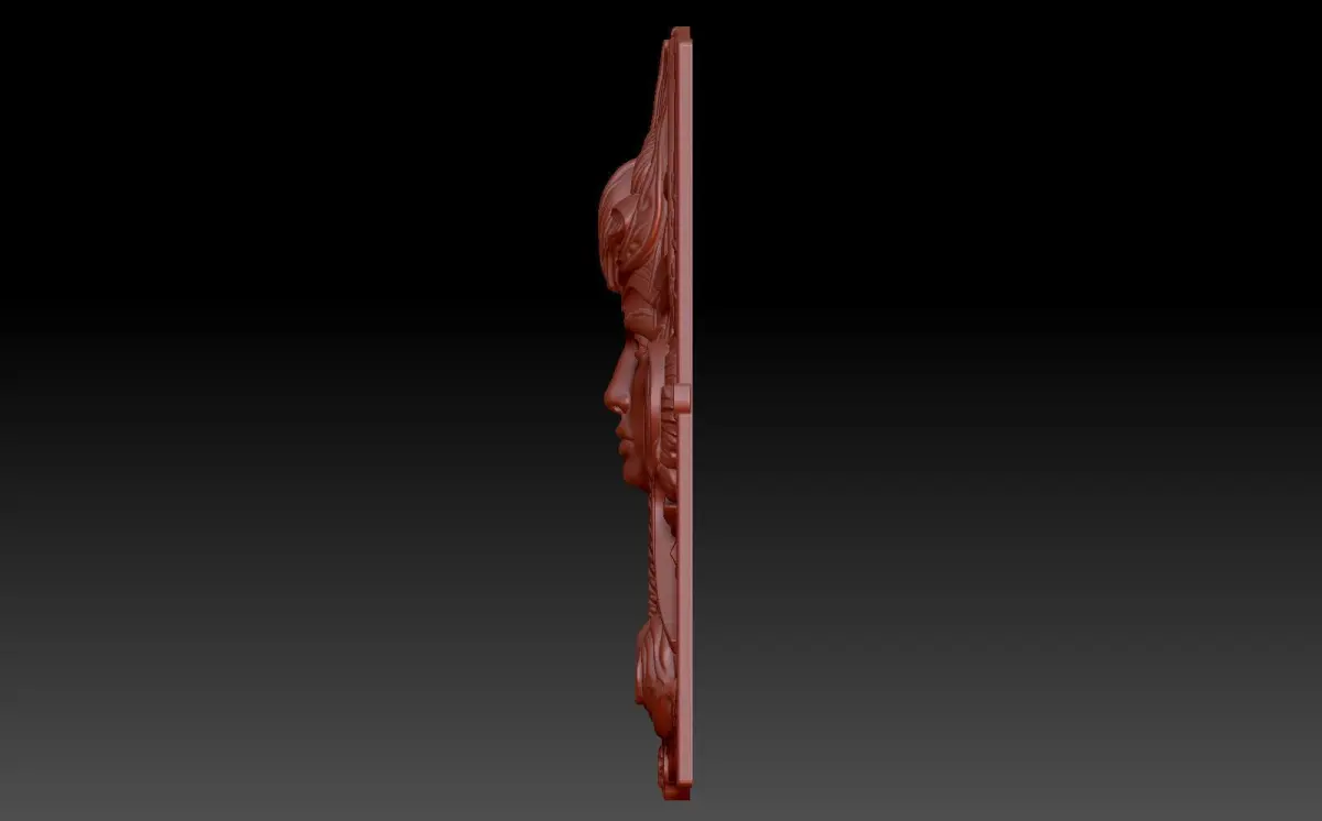 A 3D model of a bas-relief depicting a woman's face. Strict and attentive gaze, attracts attention to work. In the background, the decor is in the form of floral ornaments. The work is suitable for 3D printing and CNC machine tools.