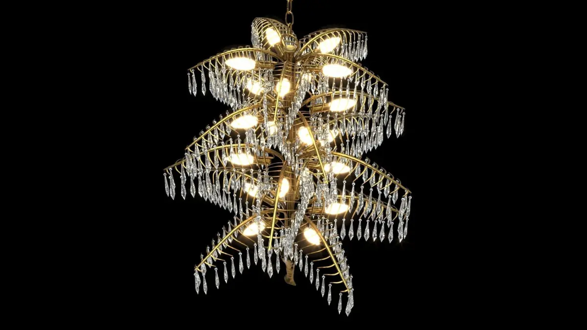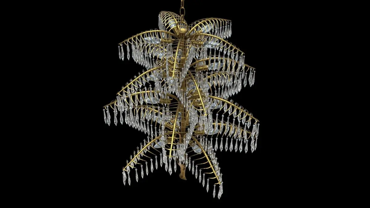 Magnificent chandelier in solid casted brass. Extraordinary elaborate finishes. Rich hangings with hand-cut crystal glasses. Surface either brass, patinated, chrome et cetera In addition there is a Palme-wall-lamp available as well as a smaller chandelier Palmino.