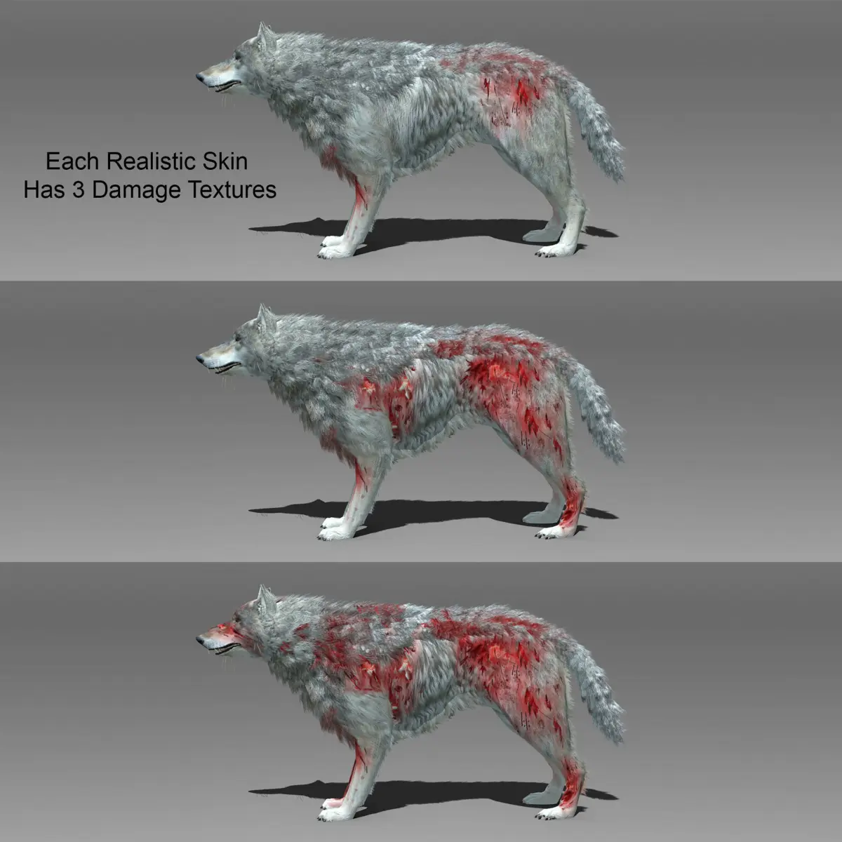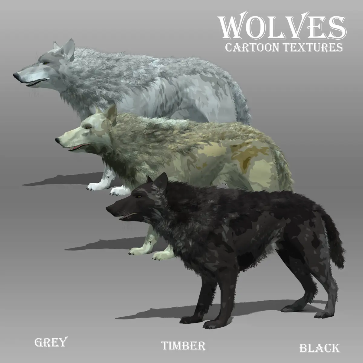 Comes with Three skins: Grey,Black and TimberEach realistic skin has three damamge textures (can add to cartoon skin on request)