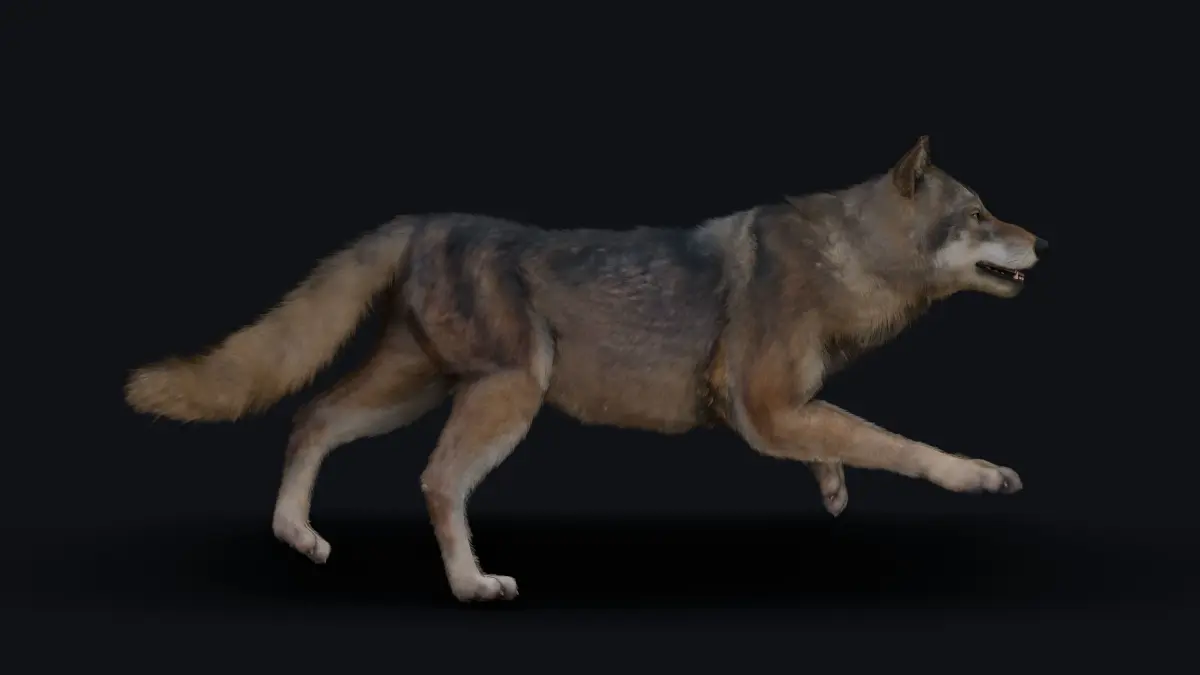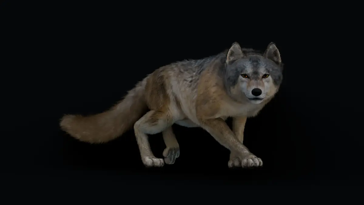 This is a high-quality wolf model with fur, rigging and 16 realistic animations. The model has a realistic muscle structure, a complex hair system created in Blender which makes the hair natural and realistic, and a detailed facial expression controlling system. This model is made with Blender and Cycles renderer at real-world scale.It consists of the body, eyes, eyelids, oral cavity, tongue, paws.