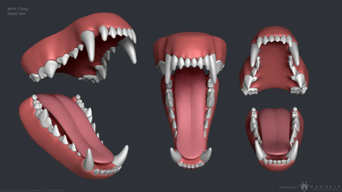 Highpoly detailed model of a wolf dental set, with teeth, tongue and gums. It can be used for dogs too.