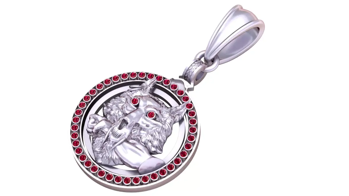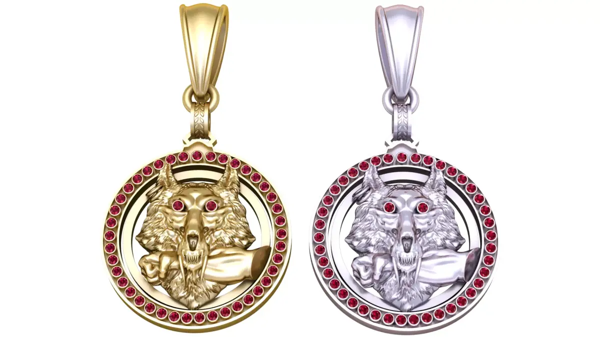 This dramatic wolf head gold pendant embodies strength, courage, and primal power. The centerpiece features a highly detailed wolf head biting a hand, symbolizing survival, dominance, and raw instinct. The eyes are set with brilliant red gemstones, giving the wolf an intense and captivating stare. Surrounding the design is a circular frame adorned with a full ring of matching red gemstones, enhancing the pendant’s regal and fierce aesthetic. A true statement of boldness, this pendant is perfect for those who value mythical symbolism, warrior spirit, and unique luxury jewelry.