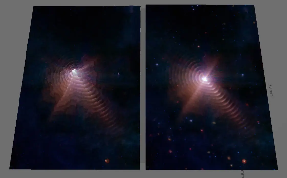 Dual star systems dust in space, whose light traveled thousand years for the our Spaces Telescope to record its photons! Where the material becomes denser, as a result of physical processes, it will be brighter and warmer, like as the sun! Somehow, the thickening matter creates deeper and deeper holes in space-time. Based on this, I created the negative gravity map of the image with the help of software, as gravity distorts a deep pit in space-time, the texture rises on the model, thus creating gravity mountains!