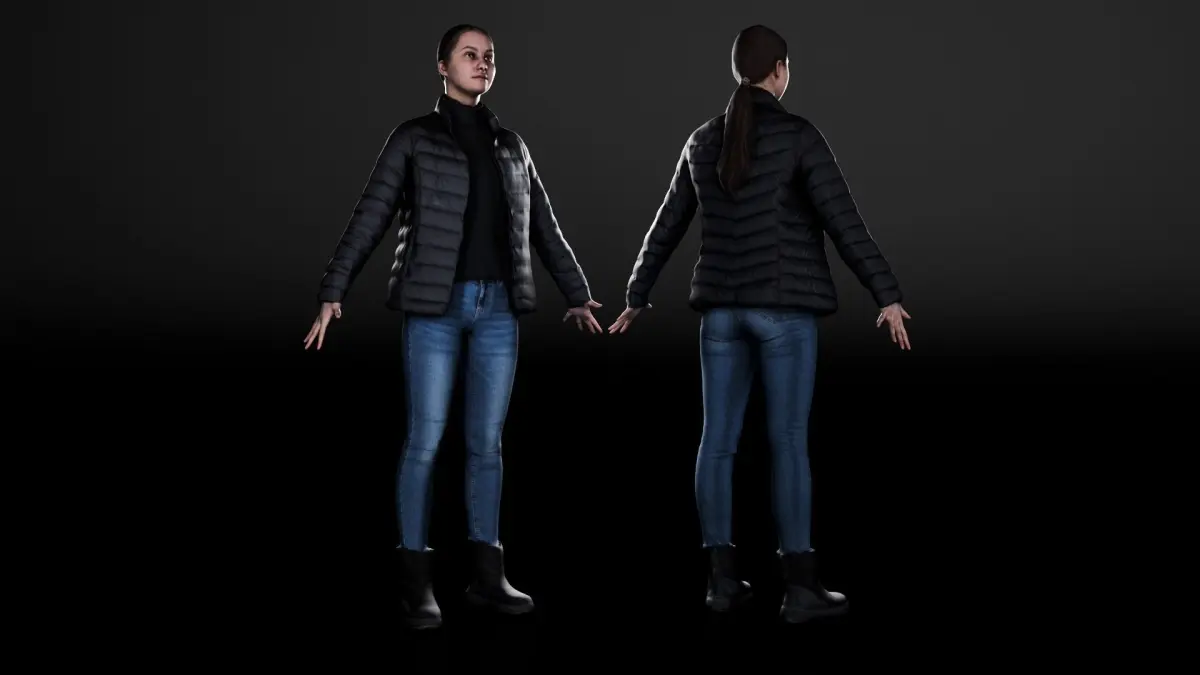 This is a true human size detailed model of a young woman of Caucasian appearance dressed in casual style. The model is captured in the A-pose with mesh ready for rigging and animation in all most usable 3d software.