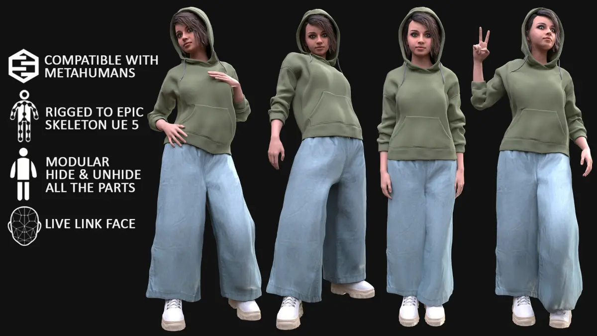 100% compatible with female Metahuman (Normal/Average body - MH Skeleton)This is not a Metahuman's body and face. This is our creation.But this body has exactly the same shape as the Metahuman's body (Normal/Average)So you can put this Outfit on your female Metahuman (Normal/Average)