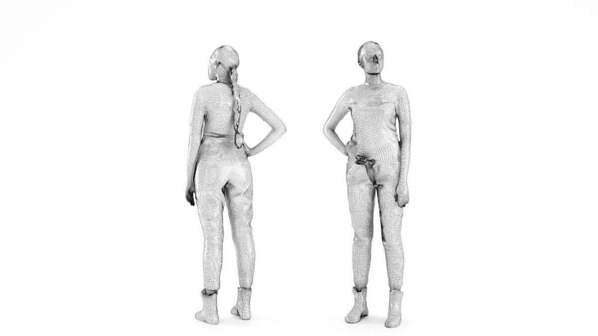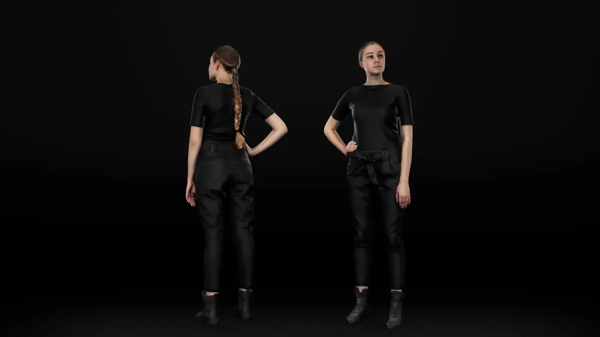 This is a true human size and detailed model of a sporty beautiful young woman of Caucasian appearance dressed in casual style. The model is captured in casual pose to be perfectly matching for variety of architectural visualizations, e.g. urban installations, city designs, outdoor design presentations etc.