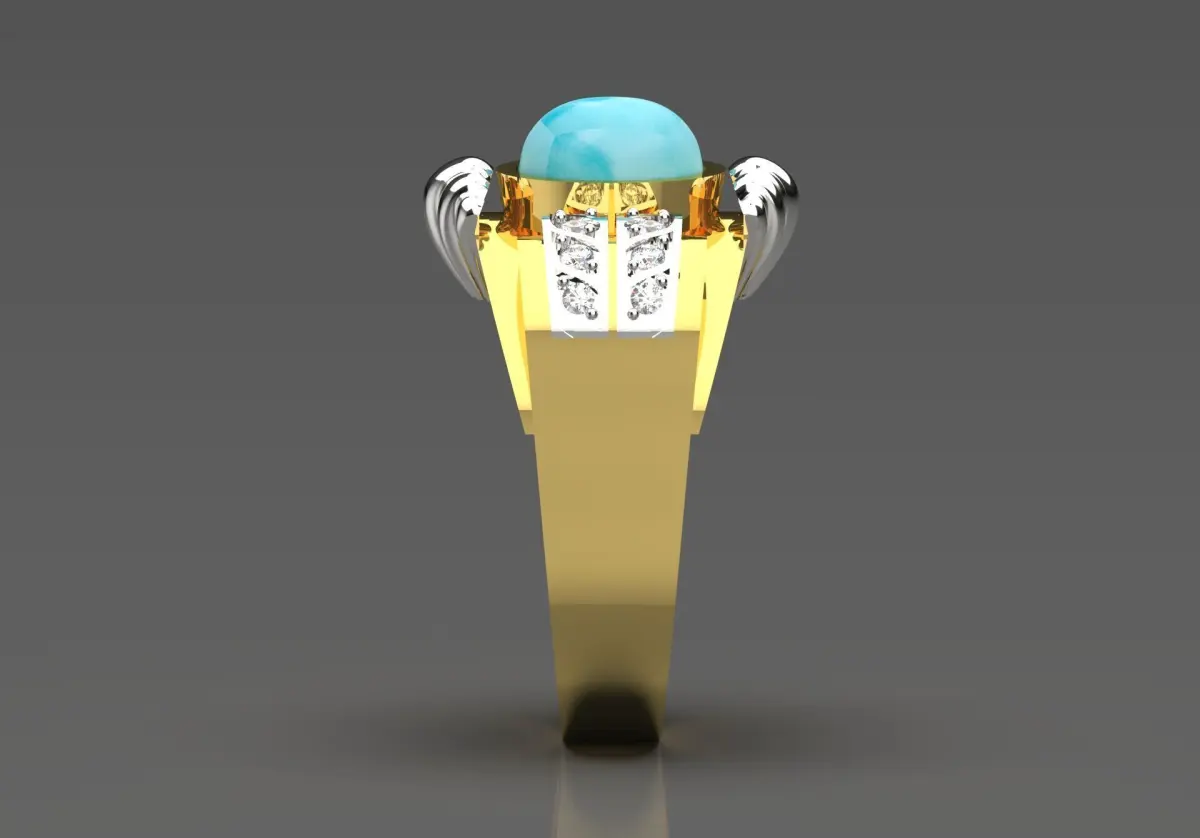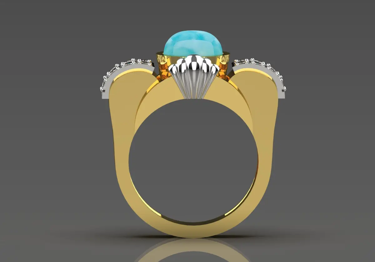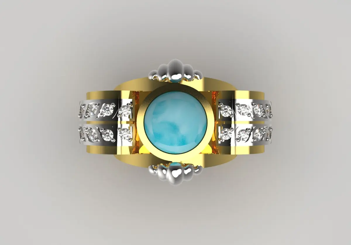 This ring showcases a striking and unique design with a luxurious feel. At its center is a large round turquoise gemstone that has a vibrant blue color and a fresh and vibrant look. Surrounding the turquoise is a wide, polished gold band that enhances its color.