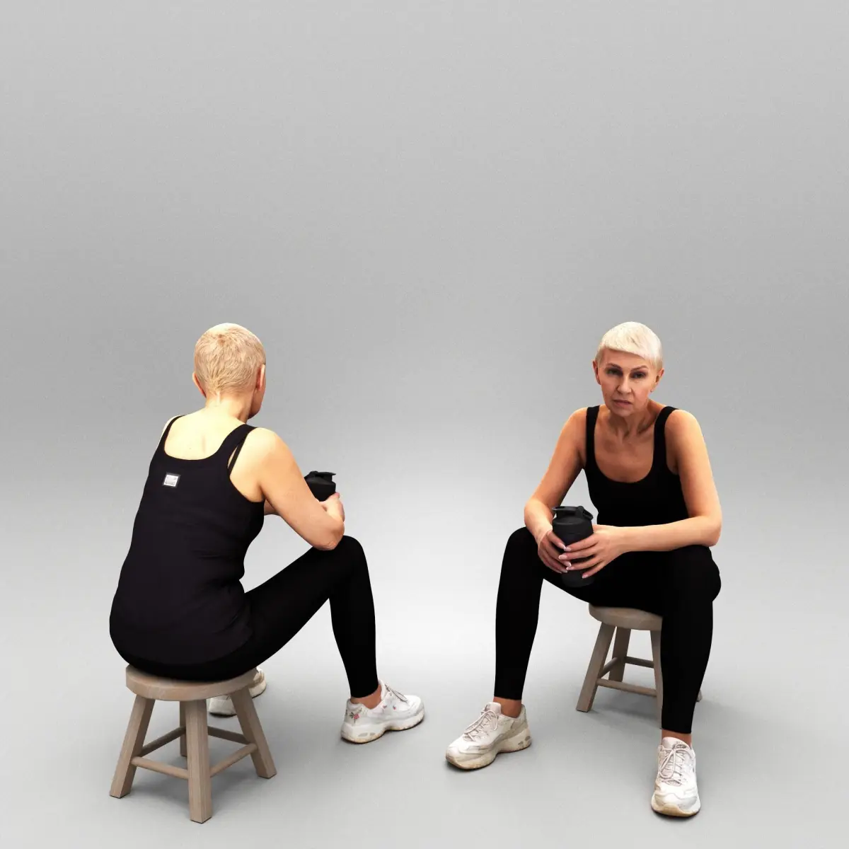 This is a true human size and detailed model of a sporty middle-aged woman of Caucasian appearance dressed in sportswear. The model is captured in casual pose to be perfectly matching various architectural and product visualizations, as a background or mid-sized character on a sports ground, gym, locker room, beach, park, VR/AR content, etc.