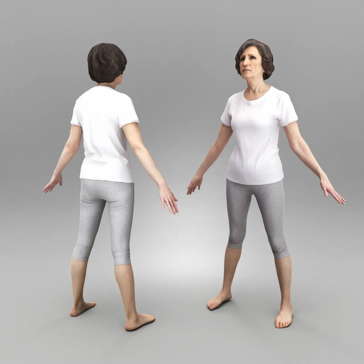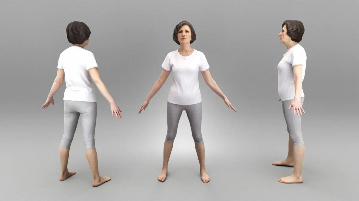 This is a true human size detailed model of a beautiful adult woman of Caucasian appearance dressed in sportswear. The model is captured in the A-pose with mesh ready for rigging and animation in all most usable 3d software.