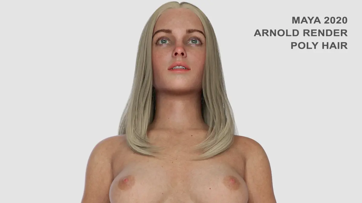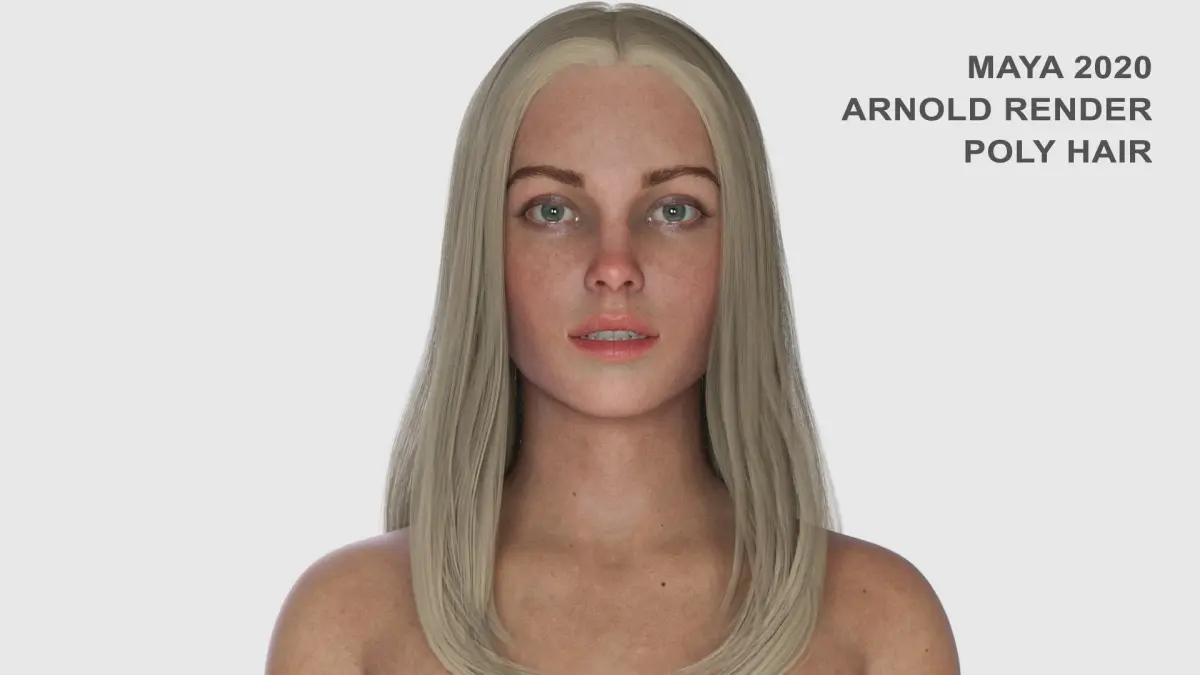 Polygonal hair is featured on the turntable and on renders marked MAYA 2020