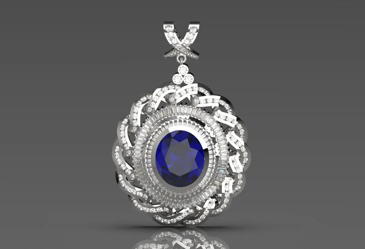 This image depicts a beautiful pendant that features a striking oval-shaped gemstone at its center. The gemstone is surrounded by a carefully crafted frame adorned with intricate details and small sparkling diamond stones that enhance its beauty. The outer design features a delicate swirl pattern that gives the piece a vintage yet timeless look. At the top of the main pendant, a bow for the chain to pass through connects it to the pendant, which is highlighted with smaller diamond gemstones that add extra sparkle. This pendant is a great statement piece, ideal for special occasions or to elevate everyday outfits with a touch of luxury.