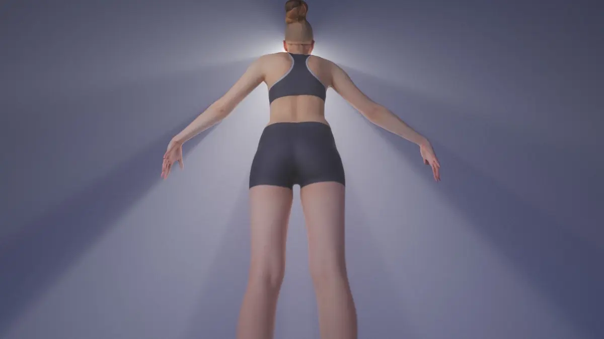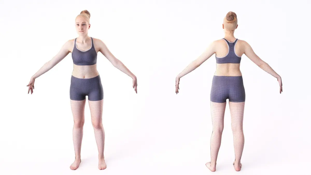 This is a true human size detailed model of a sporty beautiful young woman of Caucasian appearance. The model is captured in the A-pose with mesh ready for rigging and animation in all most usable 3d software.